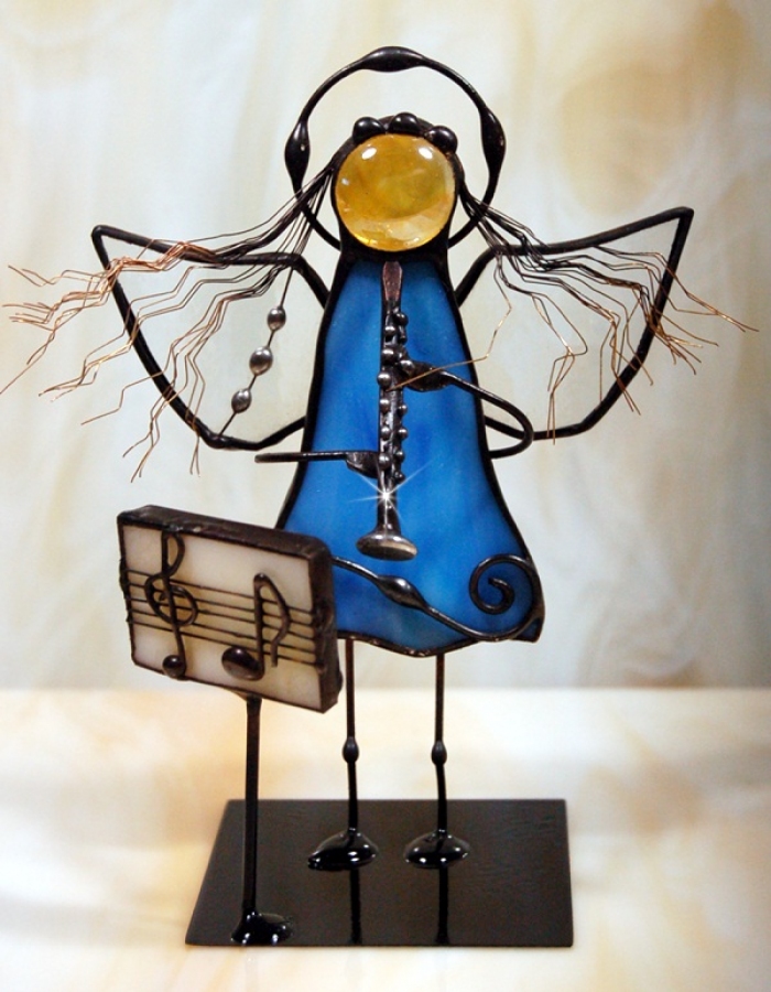 Aniołek witrażowy z klernetem wykonany z wysokiej jakości szkła witrażowego spectrum (USA) i metali kolorowych (miedź, mosiądz, cyna). Wykonanie technika Tiffany. Patynowany na czarno. Wysokość aniołka 13 cm, podstawka 6 x 6 cm. Możliwa wersja męska lub damska (z włosami). Można wybrać aniołka w dowolnym kolorze.