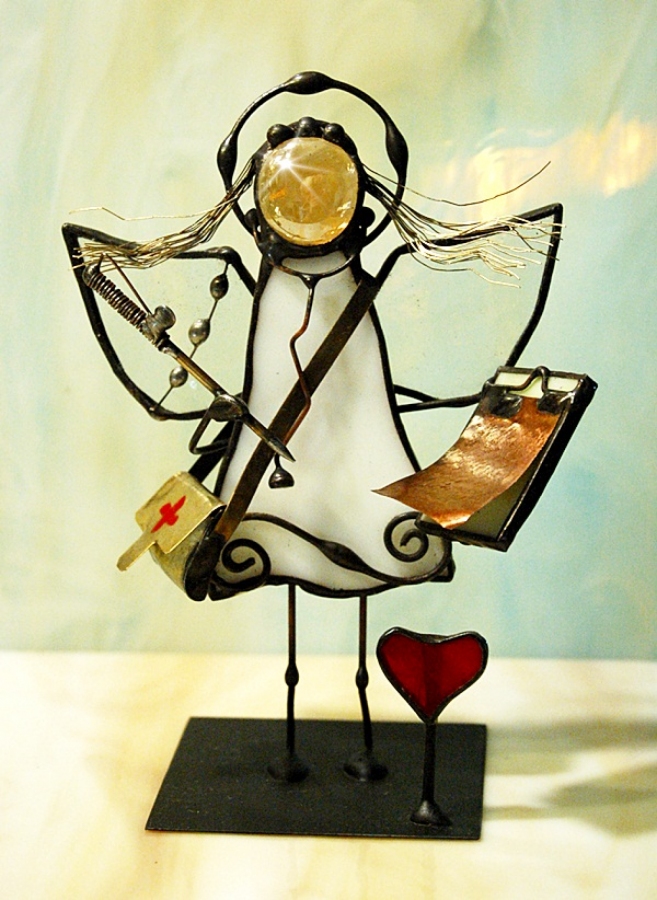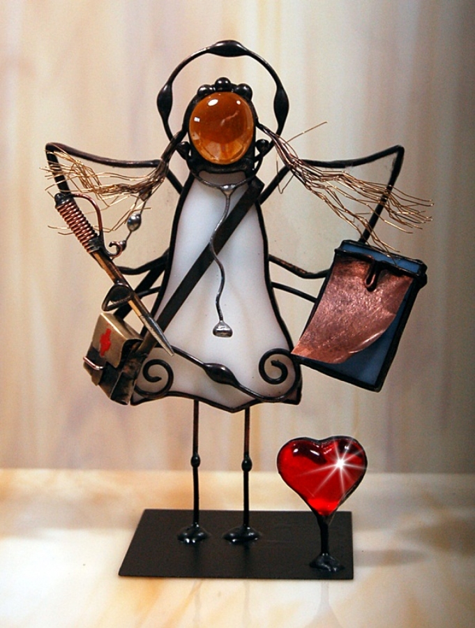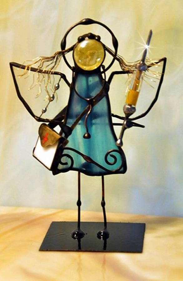Aniołek witrażowy lekarka wykonany z wysokiej jakości szkła witrażowego spectrum (USA) i metali kolorowych (miedź, mosiądz, cyna). Wykonanie technika Tiffany. Patynowany na czarno. Wysokość aniołka 13 cm, podstawka 6 x 6 cm. Możliwy wybór różnej kolorystyki przez kupującego.