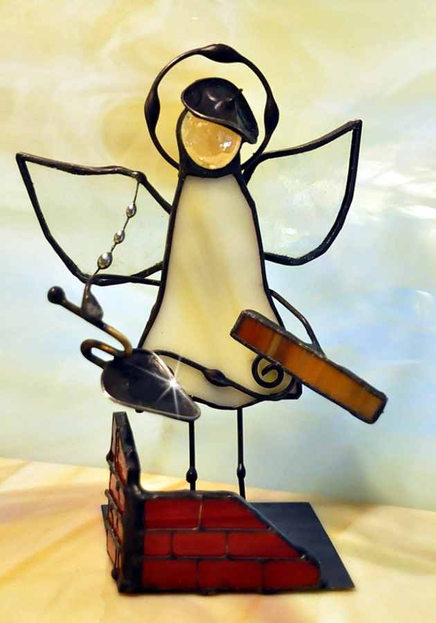 Aniołek witrażowy murarz wykonany z wysokiej jakości szkła witrażowego spectrum (USA) i metali kolorowych (miedź, mosiądz, cyna). Wykonanie technika Tiffany. Patynowany na czarno. Wysokość aniołka 13 cm, podstawka 6 x 6 cm. Można wybrać aniołka w dowolnym kolorze.