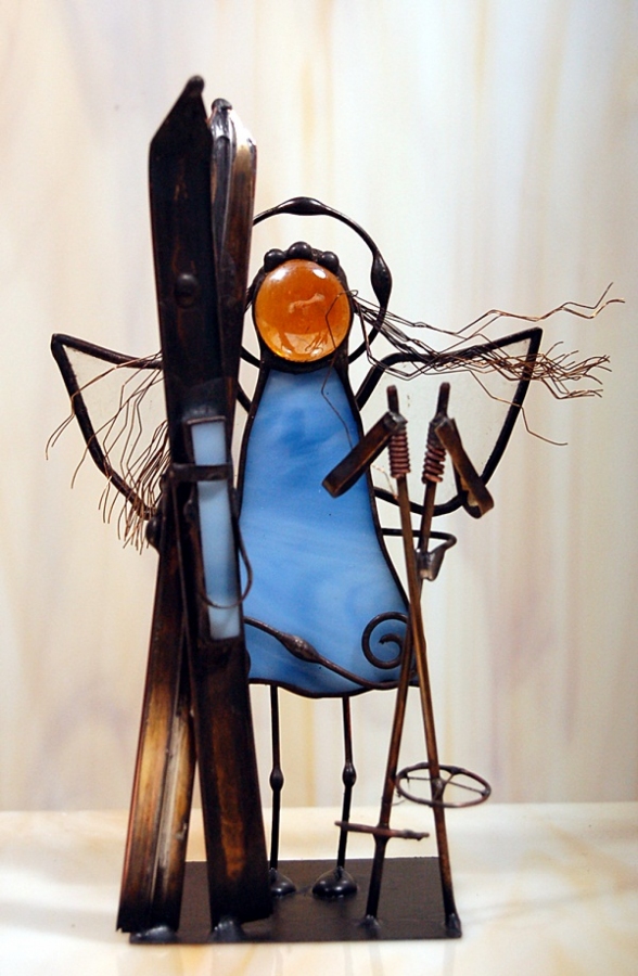 Aniołek witrażowy narciarz wykonany z wysokiej jakości szkła witrażowego spectrum (USA) i metali kolorowych (miedź, mosiądz, cyna). Wykonanie technika Tiffany. Patynowany na czarno. Wysokość aniołka 13 cm, podstawka 6 x 6 cm. Można zamówić aniołka w dowolnym kolorze.