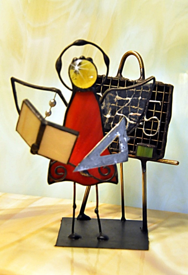 Aniołek witrażowy matematyk wykonany z wysokiej jakości szkła witrażowego spectrum (USA) i metali kolorowych (miedź, mosiądz, cyna). Wykonanie technika Tiffany. Patynowany na czarno. Wysokość aniołka 13 cm, podstawka 6 x 6 cm. Możliwa wersja męska (na zdjęciu) lub damska (z włosami). Można wybrać aniołka w dowolnym kolorze.