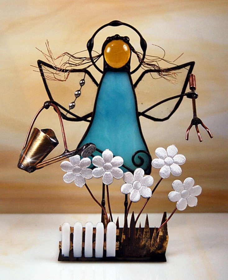 Aniołek witrażowy ogrodniczka wykonany z wysokiej jakości szkła witrażowego spectrum (USA) i metali kolorowych (miedź, mosiądz, cyna). Wykonanie technika Tiffany. Patynowany na czarno. Wysokość aniołka 13 cm, podstawka 6 x 6 cm. Można wybrać aniołka w dowolnym kolorze. Kwiatki białe lub czerwone.