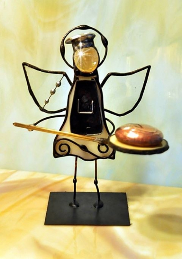 Aniołek witrażowy piekarz wykonany z wysokiej jakości szkła witrażowego spectrum (USA) i metali kolorowych (miedź, mosiądz, cyna). Wykonanie technika Tiffany. Patynowany na czarno. Wysokość aniołka 13 cm, podstawka 6 x 6 cm. Możliwy wybór różnej kolorystyki przez kupującego.