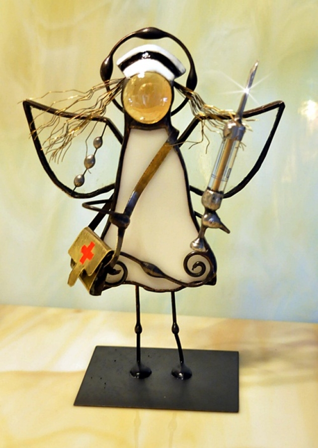 Aniołek witrażowy pielęgniarka wykonany z wysokiej jakości szkła witrażowego spectrum (USA) i metali kolorowych (miedź, mosiądz, cyna). Wykonanie technika Tiffany. Patynowany na czarno. Wysokość aniołka 13 cm, podstawka 6 x 6 cm. Możliwy wybór różnej kolorystyki przez kupującego.