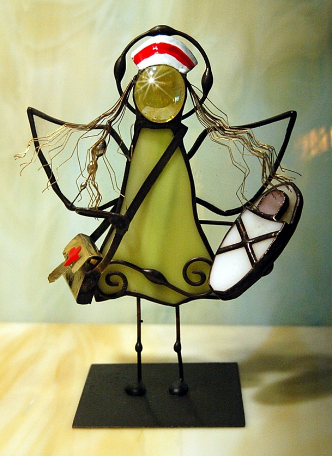 Aniołek witrażowy położna wykonany z wysokiej jakości szkła witrażowego spectrum (USA) i metali kolorowych (miedź, mosiądz, cyna). Wykonanie technika Tiffany. Patynowany na czarno. Wysokość aniołka 13 cm, podstawka 6 x 6 cm. Możliwy wybór różnej kolorystyki przez kupującego.