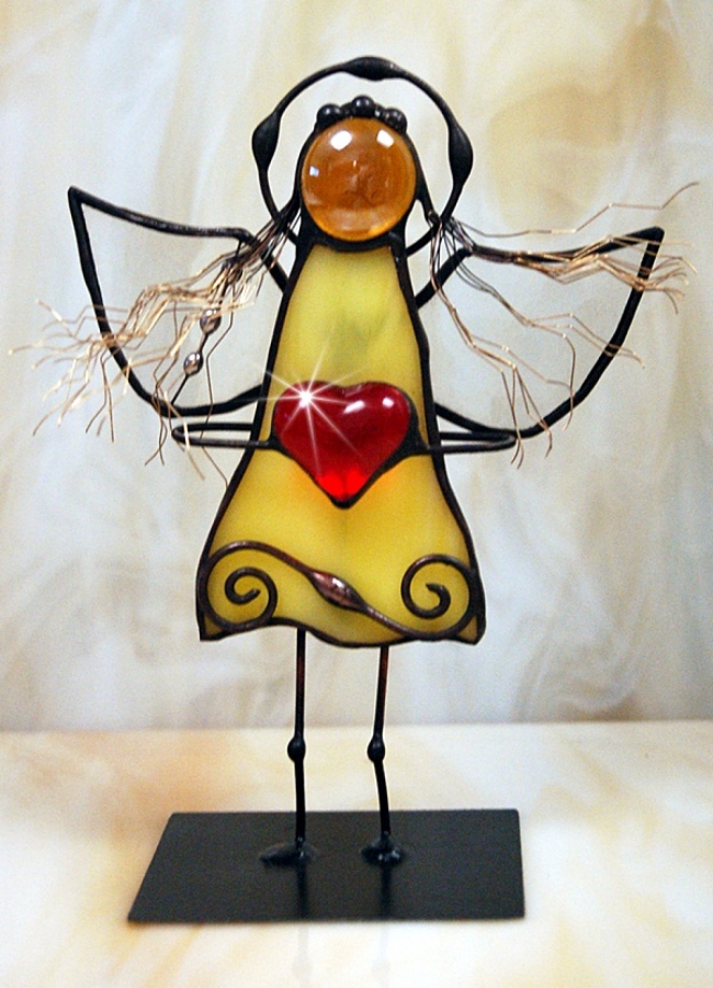 Aniołek witrażowy serdeczny wykonany z wysokiej jakości szkła witrażowego spectrum (USA) i metali kolorowych (miedź, mosiądz, cyna). Wykonanie technika Tiffany. Patynowany na czarno. Wysokość aniołka 13 cm, podstawka 6 x 6 cm. Możliwy wybór różnej kolorystyki przez kupującego.