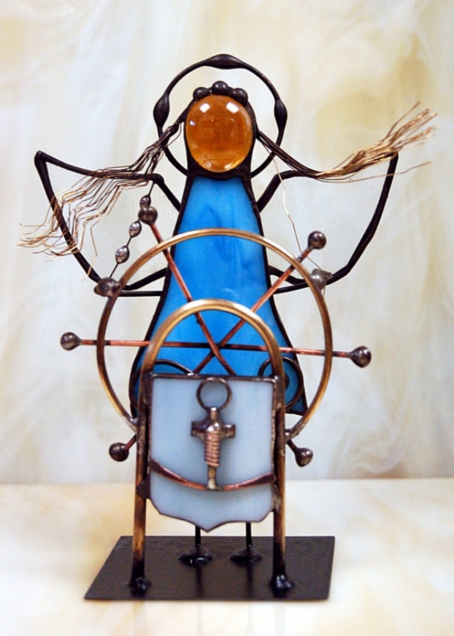Aniołek witrażowy sternik/żeglarz wykonany z wysokiej jakości szkła witrażowego spectrum (USA) i metali kolorowych (miedź, mosiądz, cyna). Wykonanie technika Tiffany. Patynowany na czarno. Wysokość aniołka 13 cm, podstawka 6 x 6 cm. Możliwa wersja męska lub damska (z włosami). Można wybrać aniołka w dowolnym kolorze.