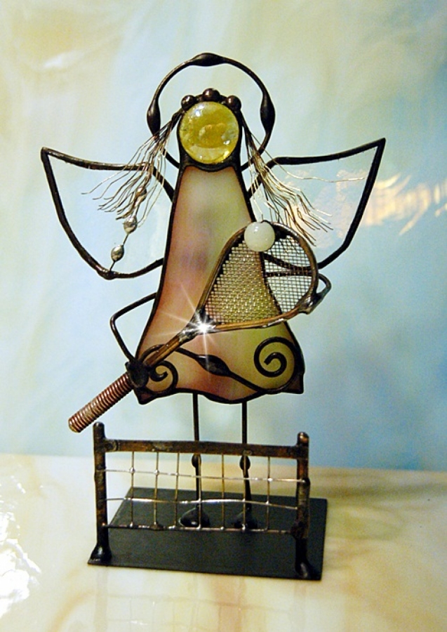 Aniołek witrażowy tenisistka wykonany z wysokiej jakości szkła witrażowego spectrum (USA) i metali kolorowych (miedź, mosiądz, cyna). Wykonanie technika Tiffany. Patynowany na czarno. Wysokość aniołka 13 cm, podstawka 6 x 6 cm. Można wybrać aniołka w dowolnym kolorze.