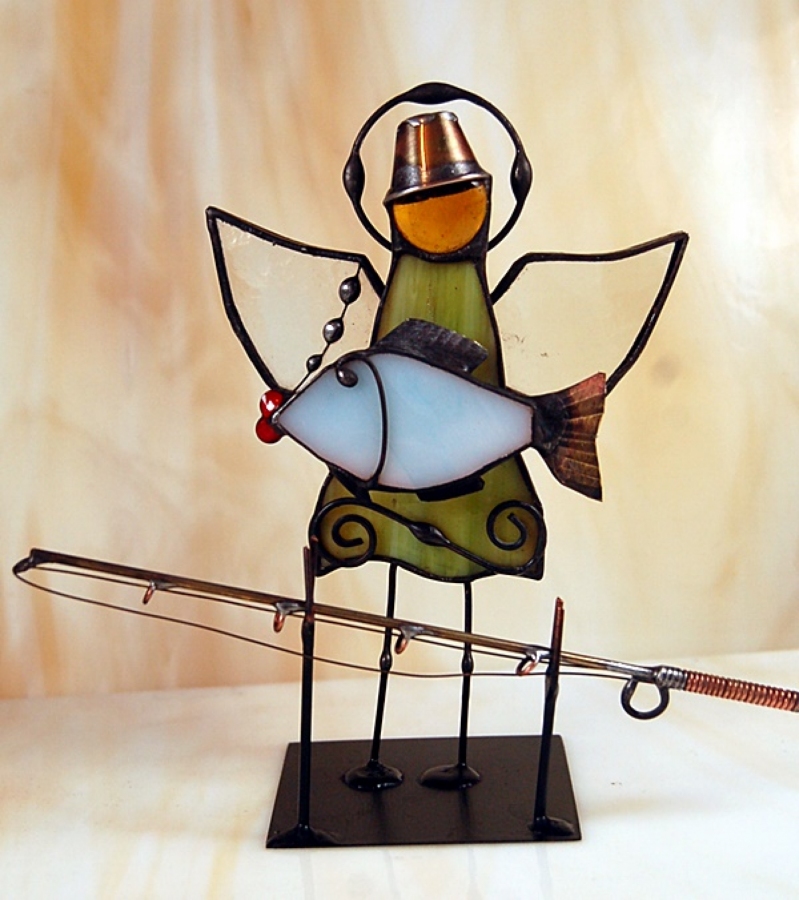 Aniołek witrażowy wędkarz wykonany z wysokiej jakości szkła witrażowego spectrum (USA) i metali kolorowych (miedź, mosiądz, cyna). Wykonanie technika Tiffany. Patynowany na czarno. Wysokość aniołka 13 cm, podstawka 6 x 6 cm. Można wybrać aniołka w dowolnym kolorze.