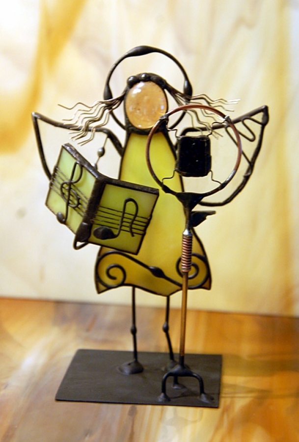 Aniołek witrażowy wokalistka wykonany z wysokiej jakości szkła witrażowego spectrum (USA) i metali kolorowych (miedź, mosiądz, cyna). Wykonanie technika Tiffany. Patynowany na czarno. Wysokość aniołka 13 cm, podstawka 6 x 6 cm. Można wybrać aniołka w dowolnym kolorze.