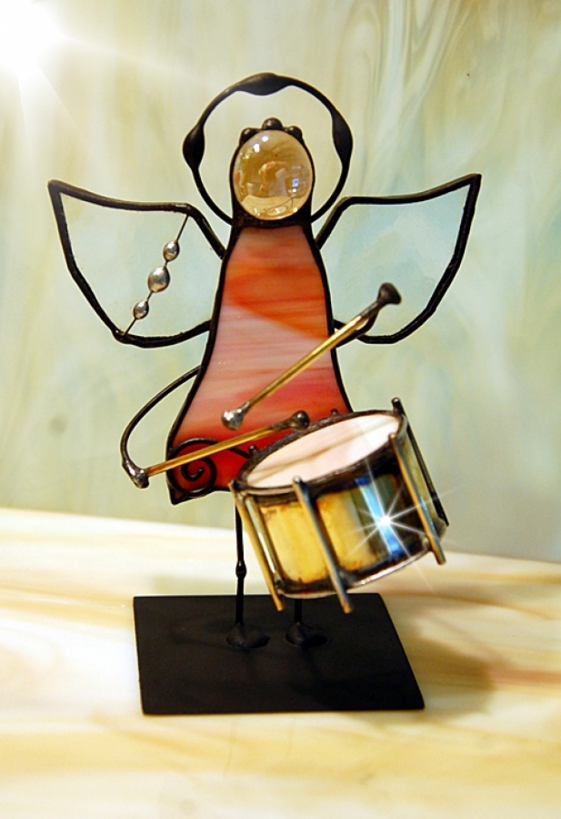 Aniołek witrażowy z bębenkiem wykonany z wysokiej jakości szkła witrażowego spectrum (USA) i metali kolorowych (miedź, mosiądz, cyna). Wykonanie technika Tiffany. Patynowany na czarno. Wysokość aniołka 13 cm, podstawka 6 x 6 cm. Możliwa wersja męska (na zdjęciu) lub damska (z włosami). Można wybrać aniołka w dowolnym kolorze.