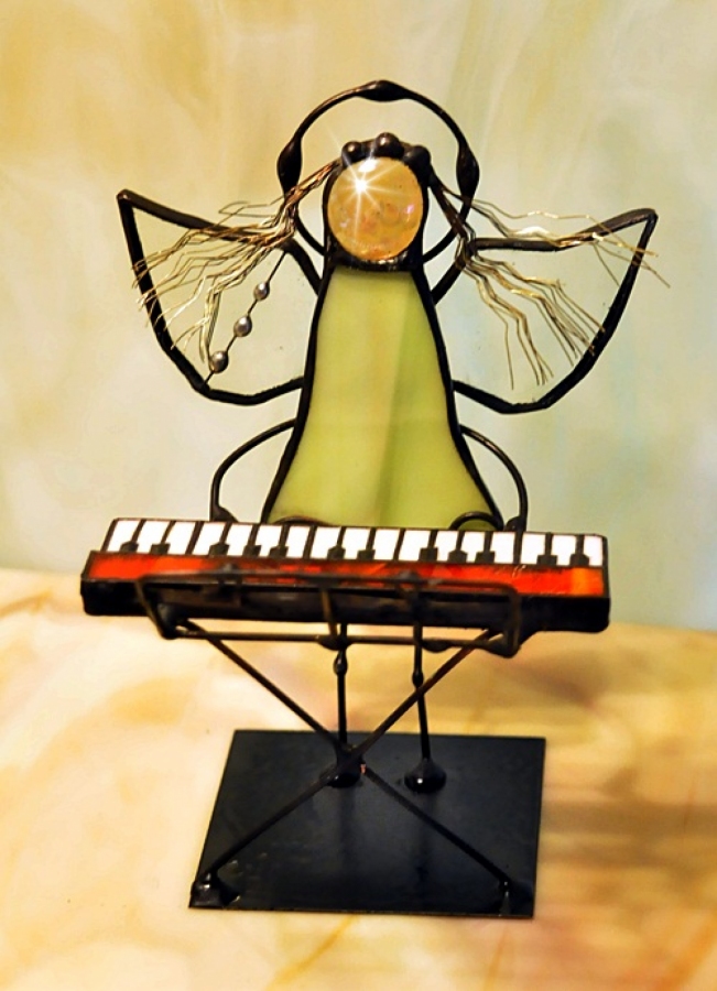 Aniołek witrażowy z keyboardem ("parapetem") wykonany z wysokiej jakości szkła witrażowego spectrum (USA) i metali kolorowych (miedź, mosiądz, cyna). Wykonanie technika Tiffany. Patynowany na czarno. Wysokość aniołka 13 cm, podstawka 6 x 6 cm. Możliwa wersja męska (na zdjęciu) lub damska (z włosami). Można wybrać aniołka w dowolnym kolorze.