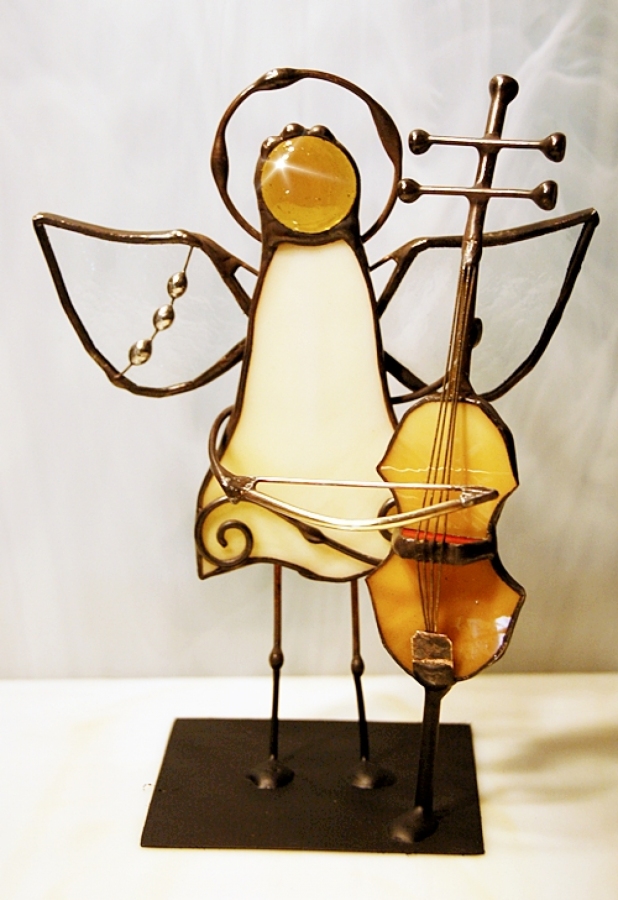 Aniołek witrażowy z wioloczelą wykonany z wysokiej jakości szkła witrażowego spectrum (USA) i metali kolorowych (miedź, mosiądz, cyna). Wykonanie technika Tiffany. Patynowany na czarno. Wysokość aniołka 13 cm, podstawka 6 x 6 cm. Możliwa wersja męska (na zdjęciu) lub damska (z włosami). Można wybrać aniołka w dowolnym kolorze.