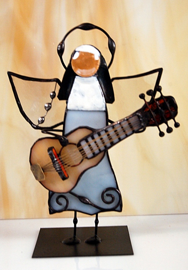 Aniołek witrażowy zakonnica z gitarą wykonany z wysokiej jakości szkła witrażowego spectrum (USA) i metali kolorowych (miedź, mosiądz, cyna). Wykonanie technika Tiffany. Patynowany na czarno. Wysokość aniołka 13 cm, podstawka 6 x 6 cm. Możliwy wybór różnej kolorystyki przez kupującego.
