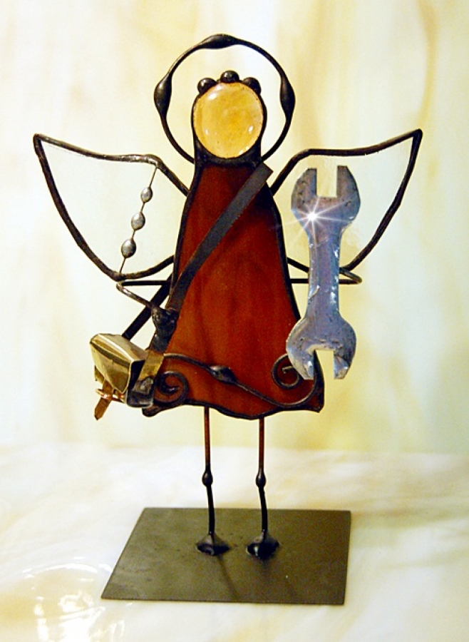 Aniołek witrażowy mechanik wykonany z wysokiej jakości szkła witrażowego spectrum (USA) i metali kolorowych (miedź, mosiądz, cyna). Wykonanie technika Tiffany. Patynowany na czarno. Wysokość aniołka 13 cm, podstawka 6 x 6 cm. Można wybrać aniołka w dowolnym kolorze.