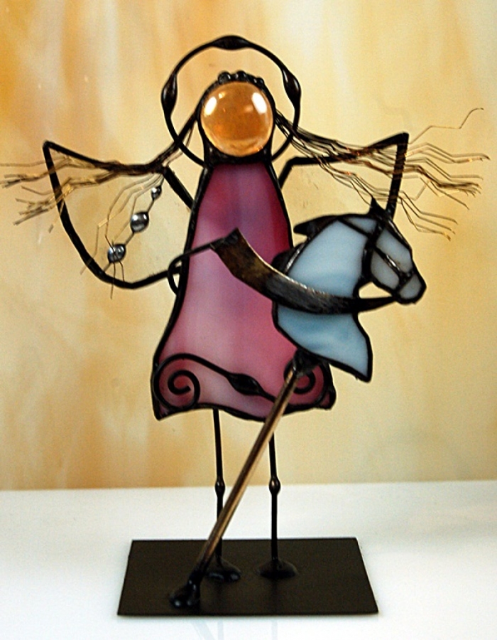 Aniołek witrażowy z konikiem wykonany z wysokiej jakości szkła witrażowego spectrum (USA) i metali kolorowych (miedź, mosiądz, cyna). Wykonanie technika Tiffany. Patynowany na czarno. Wysokość aniołka 13 cm, podstawka 6 x 6 cm. Możliwa wersja męska (na zdjęciu) lub damska (z włosami). Można wybrać aniołka w dowolnym kolorze.