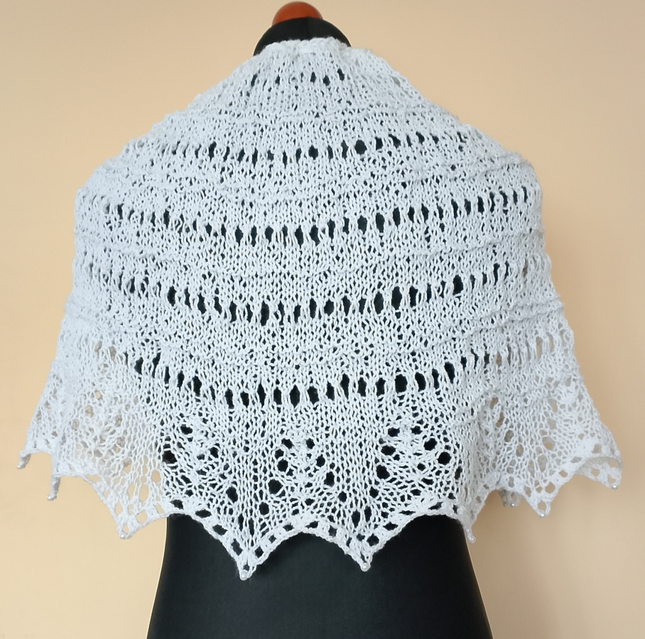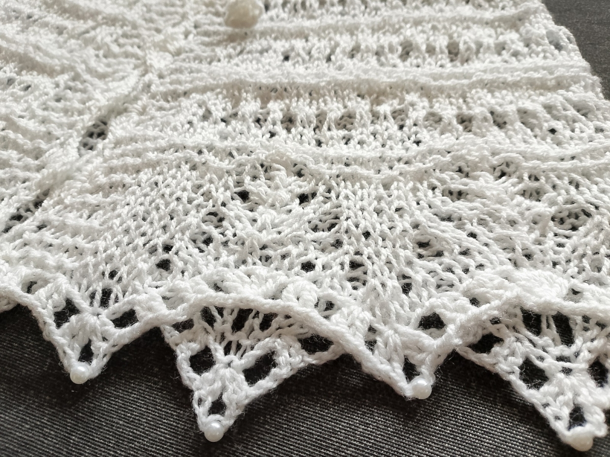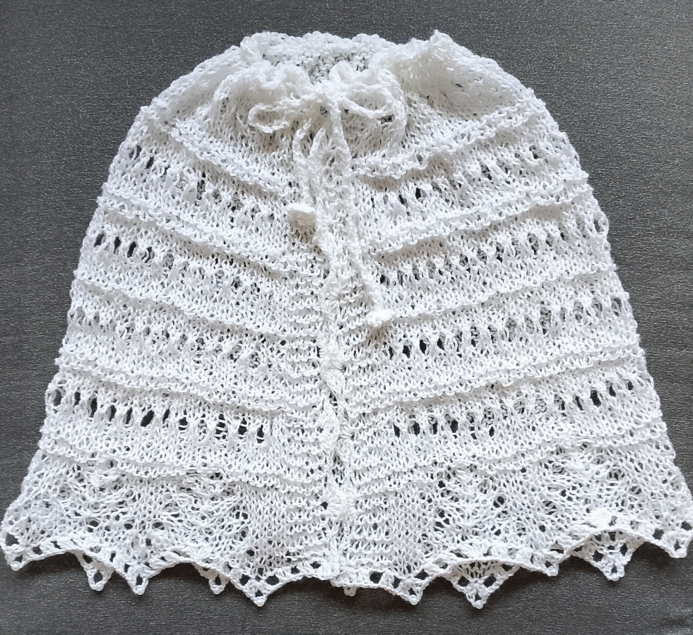 Biała komunijna pelerynka wykonana w całości ręcznie na drutach z przyjemnej w dotyku włóczki akrylowej. Zakończona koronkowym wzorem, oraz perłowymi koralikami. Wiązana wokół szyi ozdobnym sznureczkiem z szydełkowymi kwiatkami na końcach. Wiązanie umożliwia regulację obwodu. Długość 45 cm, obwód dołu 110 cm. Rozmiar uniwersalny. Pasuje do każdego komunijnego stroju, zapewni ciepło i doda elegancji Gotowa do wysyłki.