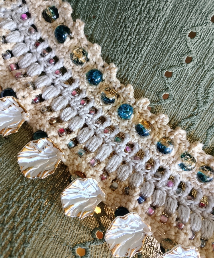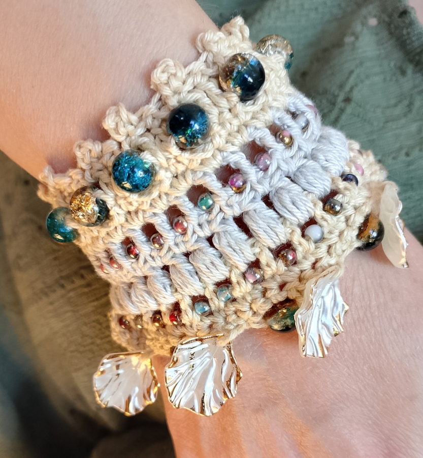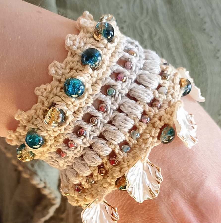 Bransoletka wykonana koronkowym wzorem, ozdobiona koralikami. Jest bardzo delikatna i przyjazna dla skóry, ponieważ została wykonana z bawełny 100%. Nie uczula. Łatwa do samodzielnego zapięcia. Bransoletka jest elastyczna, dopasuje się do rozmiaru nadgarstka. Szerokość 7 cm, obwód 15-18 cm. Autorski projekt i wykonanie. Gotowa do wysyłki.