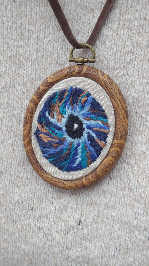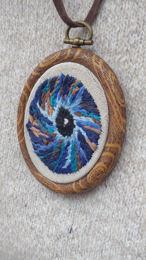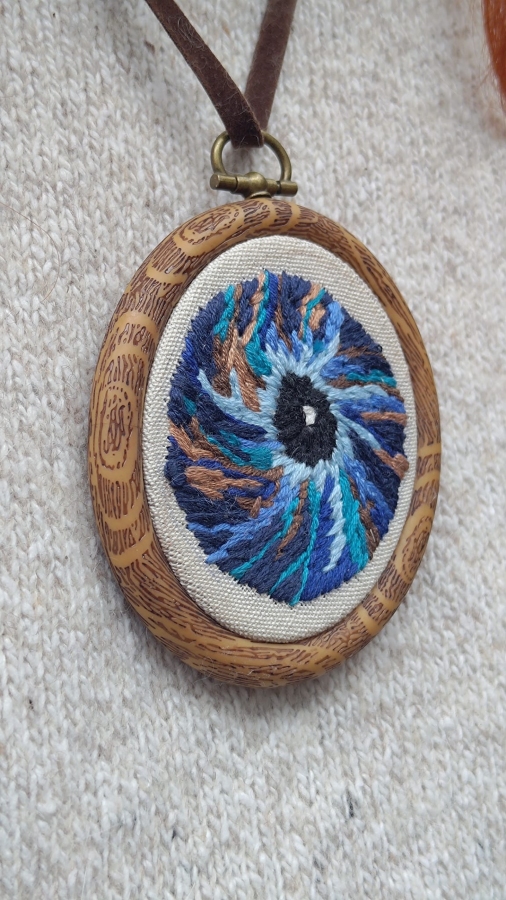 Breloko-wisior to idealny dodatek dla tych, którzy chcą widzieć więcej. Haftowany ręcznie, z czułością, przez nieidealne dłonie. Mieszanka bawełnianych i poliestrowych mulin przechodzi przez bawełniane podłoże. Tył wykończony filcem. Rzemień nie jest elementem produktu. Dodatkowe informacje: - zawieszka jest wyciągana, więc może zostać połknięta przez dziecko. - nie zbliżać do ognia, nie moczyć. - nie używać, jeśli występuje alergia na którykolwiek z materiałów. Użytkowanie: Produktu można używać jako ozdoby, również jako dodatku do ubrania, biżuterii lub osobnej dekoracji. Czyszczenie i pielęgnacja: Czyścić delikatnie wilgotną szmatką, bez użycia detergentów; Unikać kontaktu z wodą, perfumami i kosmetykami; Przechowywać w suchym miejscu, najlepiej w woreczku materiałowym; Nie prać w pralce ani nie moczyć. Przechowywanie: Przechowywać w pozycji płaskiej, aby uniknąć deformacji haftu; Chronić przed promieniami słonecznymi, które mogą powodować blaknięcie kolorów Uwagi: Produkt delikatny — nie zaleca się noszenia podczas intensywnych aktywności fizycznych; Nie należy umieszczać produktu w ogniu, wrażliwy na temperaturę; Haft może ulec uszkodzeniu przy silnym tarciu lub zaczepieniu.