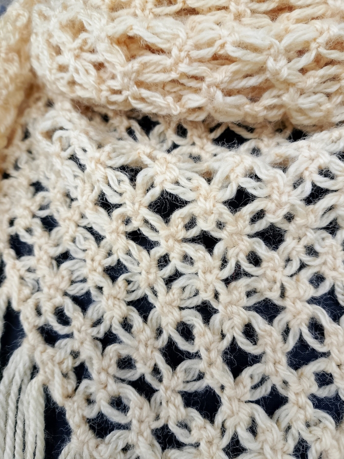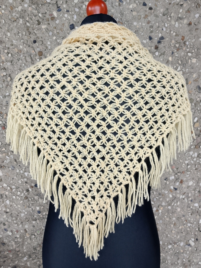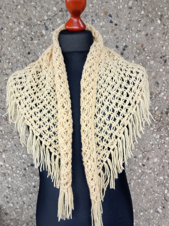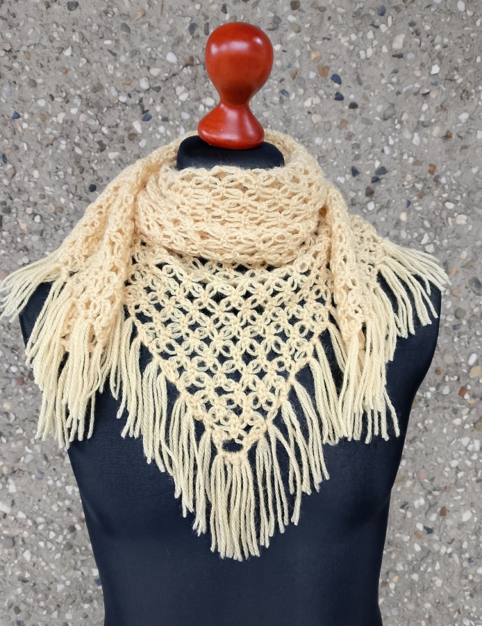 Nieduża chusta wykonana w całości ręcznie pięknym wzorem z włóczki akrylowej. Zakończona ozdobnymi frędzlami. Chusta jest klasyczna i ponadczasowa. Doda uroku każdej stylizacji. Wymiary: 120 cm x 60 cm. Kolor żółty w odcieniu karmelowym. Gotowa do natychmiastowej wysyłki