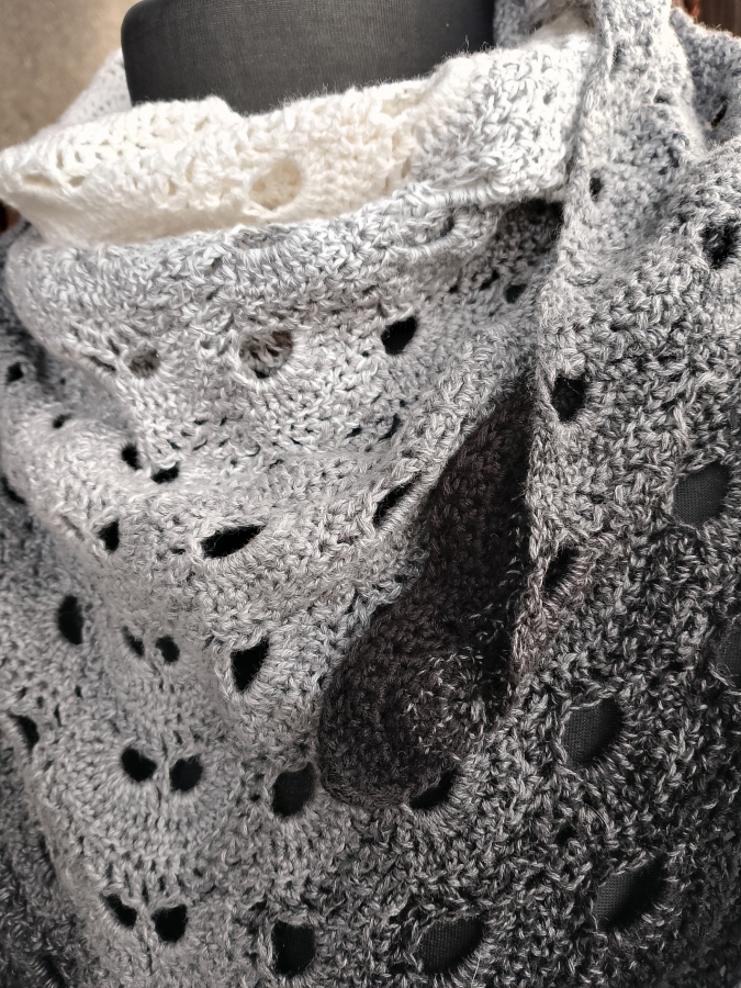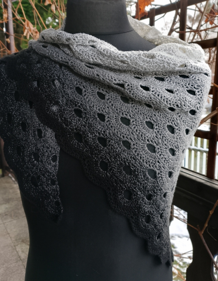 Chusta szydełkowa wykonana ręcznie pięknym wzorem z włóczki odpornej na mechacenie (akryl 50% bawełna 50%), bardzo przyjemnej w dotyku (nie gryzie). Uroku dodają jej ładne przejścia kolorystyczne od kremowej bieli poprzez jasno szary, szary, do czarnego, tworząc efekt ombre. Sprawdzi się na każdą okazję. Wymiary: długość 135 cm, wysokość 60 cm. Gotowa do natychmiastowej wysyłki.
