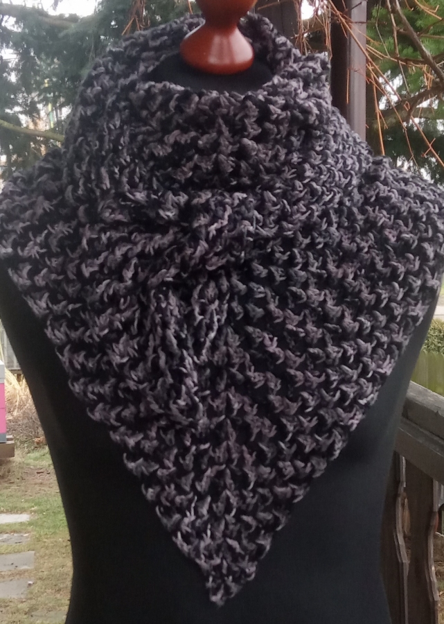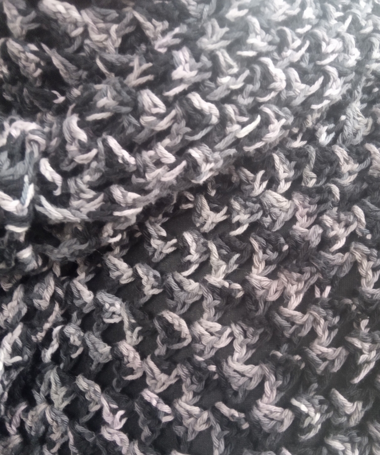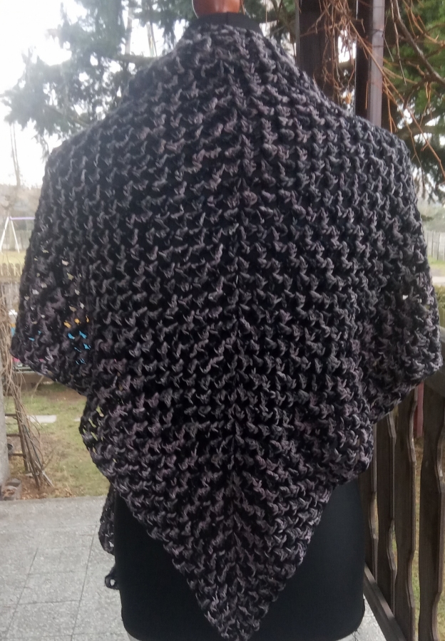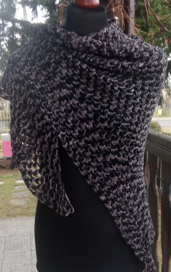 Chusta wykonana ręcznie z cieniowanej włóczki akrylowo - bawełnianej, odpornej na mechacenie. Do jej wykonania użyto trzech nitek naraz - w kolorach: czarny, szary, szary róż., w wyniku czego powstał ciekawy melanż kolorystyczny Bardzo ładna i twarzowa, o klasycznym, ponadczasowym wzorze. Wymiary: długość 170 cm, wysokość 75 cm. Powstała wyłącznie w jednym egzemplarzu. Gotowa do natychmiastowej wysyłki.