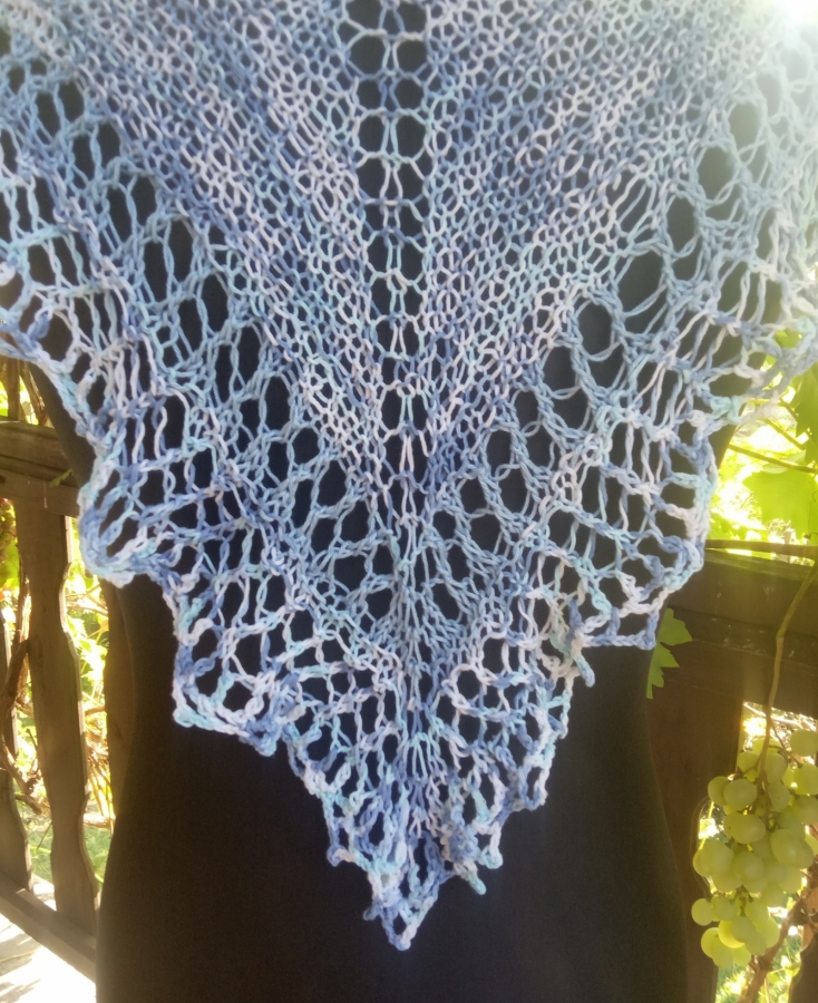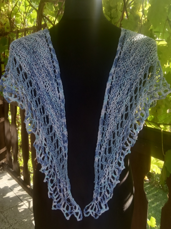 Wyjątkowa chusta w całości wykonana ręcznie na drutach, zakończona ażurowym koronkowych wzorem.. Jest przyjazna dla skóry, bardzo miła w dotyku oraz odporna na mechacenie. Ozdobi i sprawdzi się na każdą okazję. Wymiary: 160 cm x 60 cm. Kolory cieniowane: błękity, niebieskości, jasny turkus, biel. Bawełna 100 %. Gotowa do natychmiastowej wysyłki. Powstała wyłącznie w jednym egzemplarzu.