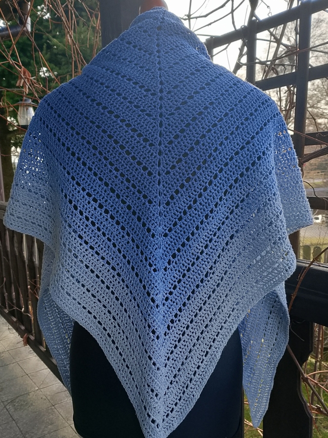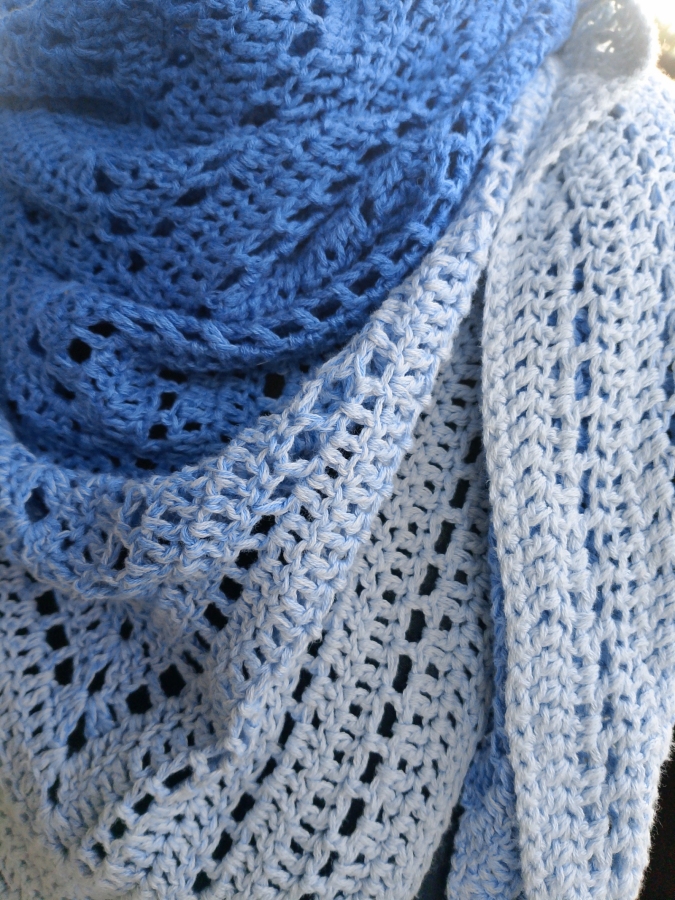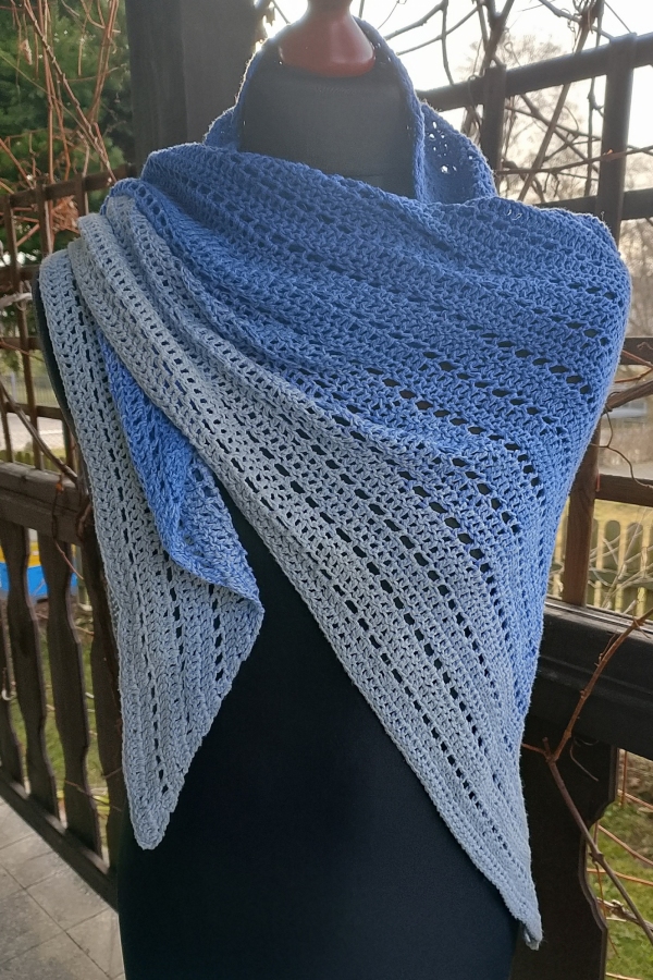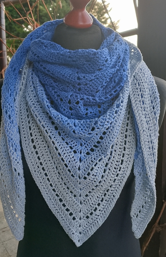 Bardzo ładna chusta w całości wykonana ręcznie z cieniowanej włóczki akrylowo - bawełnianej odpornej na mechacenie. Ozdobi i sprawdzi się na każdą okazję. Wymiary: 180 cm x 80 cm. Kolory cieniowane: od niebieskiego poprzez jasno niebieski do pastelowo niebieskiego. Gotowa do natychmiastowej wysyłki. Powstała wyłącznie w jednym egzemplarzu.