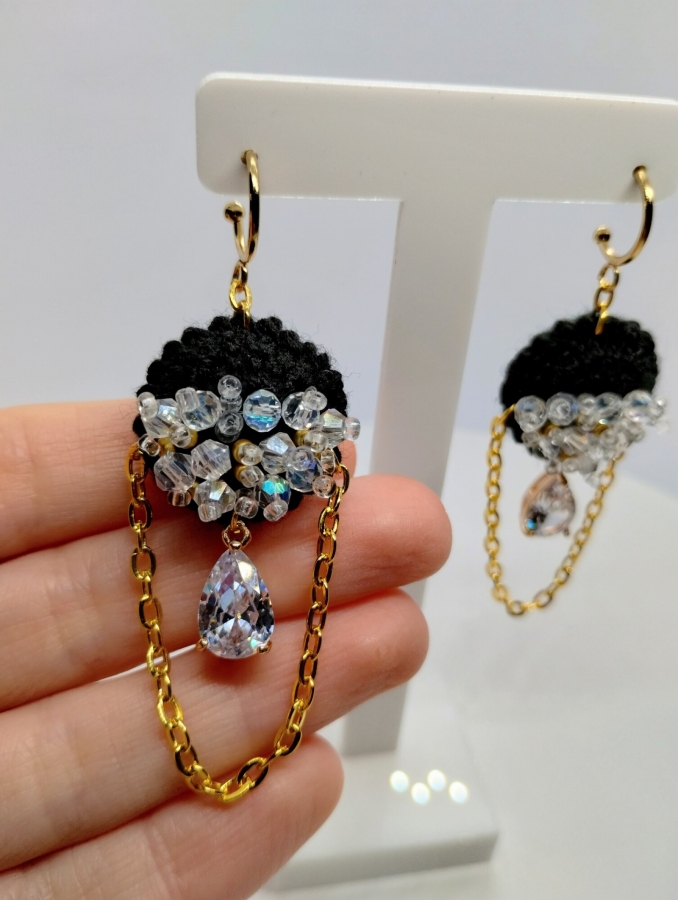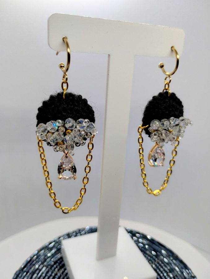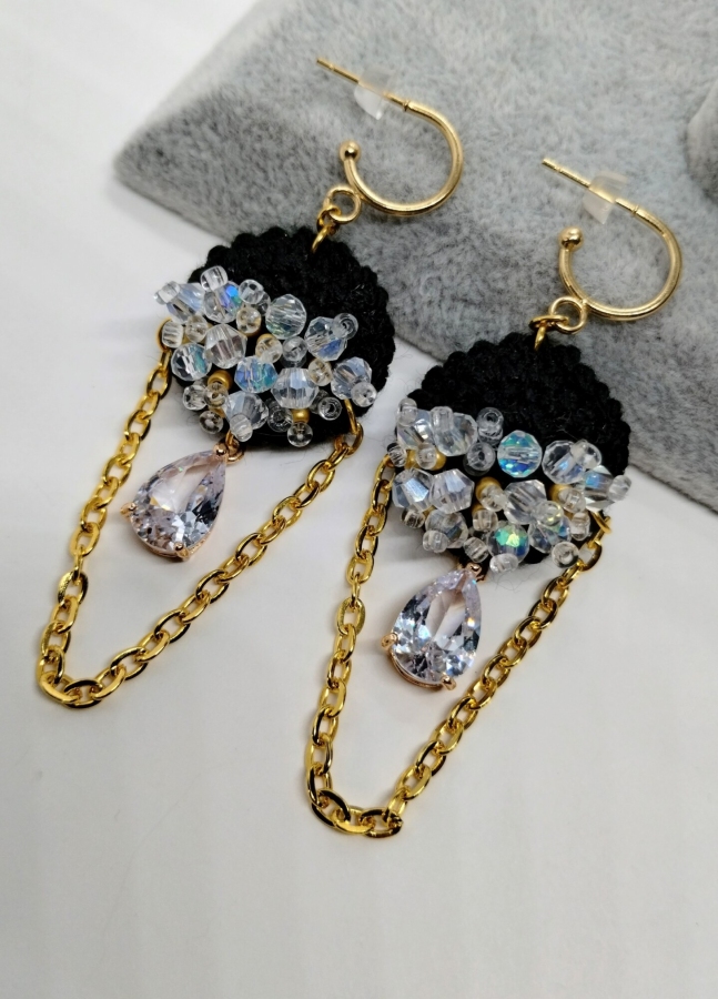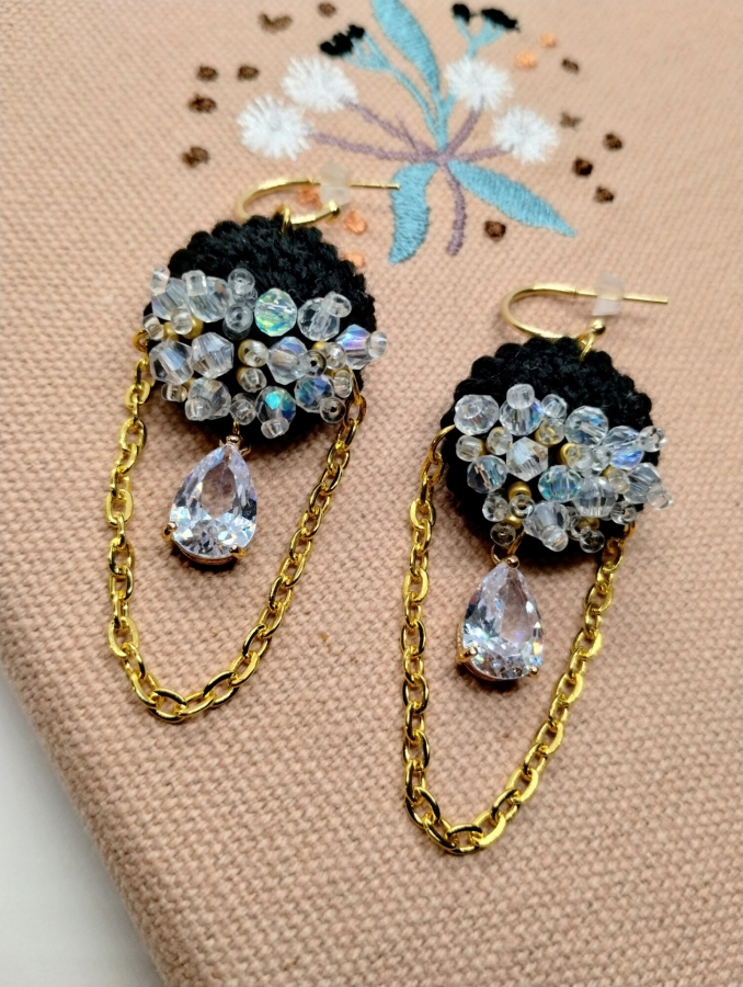 Eleganckie czarne kolczyki zaprojektowane z dbałością o każdy detal. Ich dekoracyjne zawieszki – kryształki w złotej stalowej oprawie – przyciągają wzrok intensywnym połyskiem i pięknie odbijają światło. Zostały połączone z delikatnymi łańcuszkami ze stali szlachetnej, które poruszają się lekko przy każdym ruchu, dodając całości finezji i subtelnego blasku. Szydełkowe, miękkie elementy w głębokiej czerni tworzą wiodący motyw projektu. Starannie wyszyte do połowy połyskującymi szklanymi koralikami, prezentują efektowne w zestawieniu z włóczką. To połączenie nadaje kolczykom nowoczesny, wyważony charakter – elegancki, a zarazem wyrazisty. Całość została osadzona na klasycznych, okrągłych biglach ze stali szlachetnej w odcieniu złota. Kolczyki zachwycają lekkością i precyzją wykonania – doskonale sprawdzą się w wyjściowych stylizacjach.