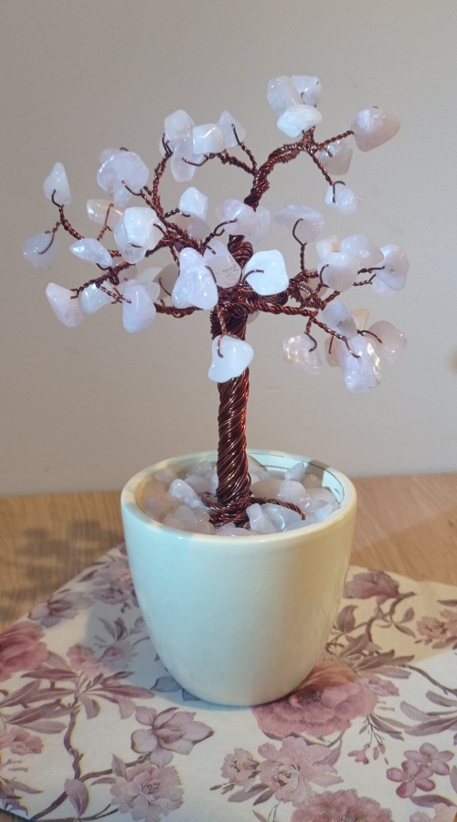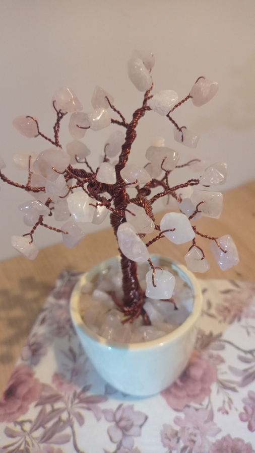 Drzewko szcześcia wypełnione z kanmienia naturalnego - różowego kwarcu oraz drutu miedzianego. Posadzone w doniczkę( wys. 6,5cm). Drzewko może służyć jak dekoracja pokuju lub biura, lub być pięknym prezentem dla osoby kochającej unikatowe rzeczy.