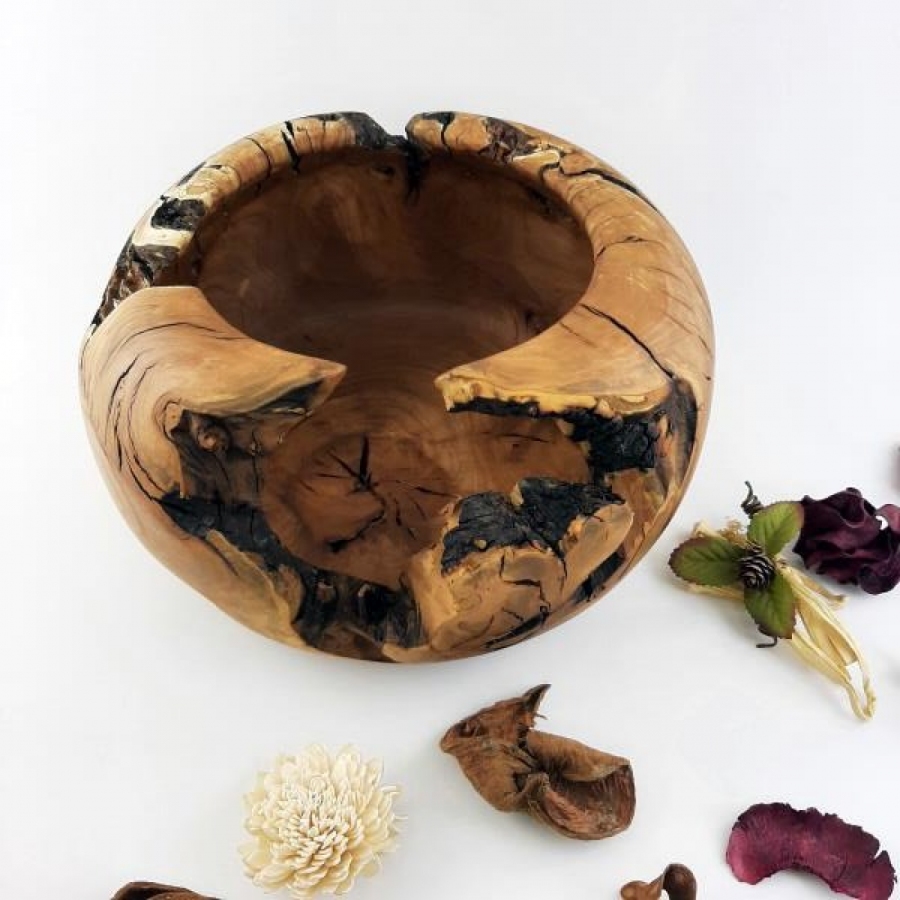 Duch Drzewa – Monumentalna misa z korzenia jabłoni Przedstawiamy przedmiot, w którym czas zatrzymał się w drewnie. Ta monumentalna misa dekoracyjna została wytoczona z jednego, starannie wyselekcjonowanego kawałka korzenia jabłoni. Jej forma to dialog między artystą a naturą – masywne ścianki kontrastują z delikatnymi, naturalnymi prześwitami i otworami, które tworzą unikatową, ażurową strukturę. Wyraziste słoje o głębokich, ciepłych barwach płynnie przechodzą w ciemne, niemal czarne akcenty naturalnego twardzielu. To nie tylko naczynie, to rzeźba, która ożywi każde wnętrze, nadając mu autentyczności i pierwotnej siły.