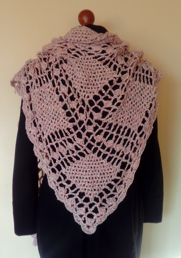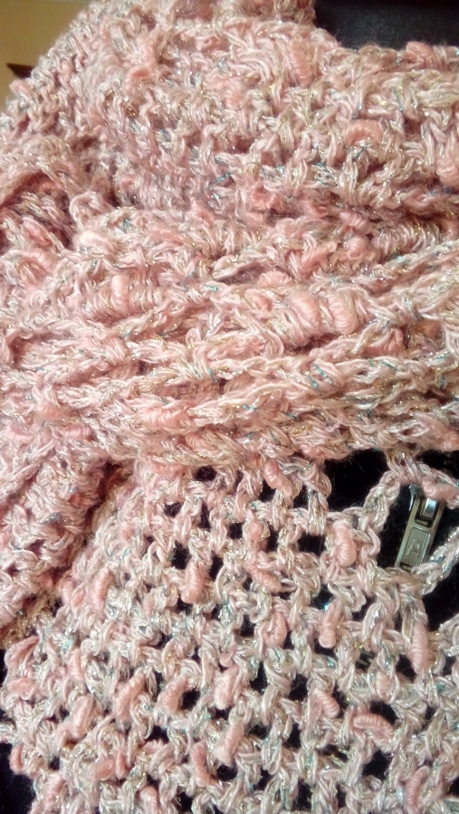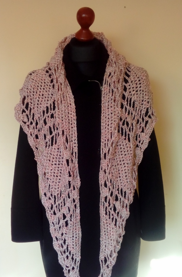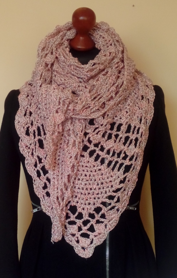 Duża chusta wykonana ręcznie z odpornej na mechacenie fantazyjnej włóczki akrylowo - bawełnianej z dodatkiem błyszczącej kolorami srebrnej nitki. Wymiary: długość 200 cm, wysokość 95 cm. Kolor brudny róż. Powstała wyłącznie w jednym egzemplarzu.