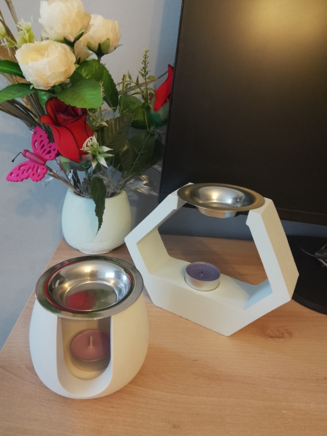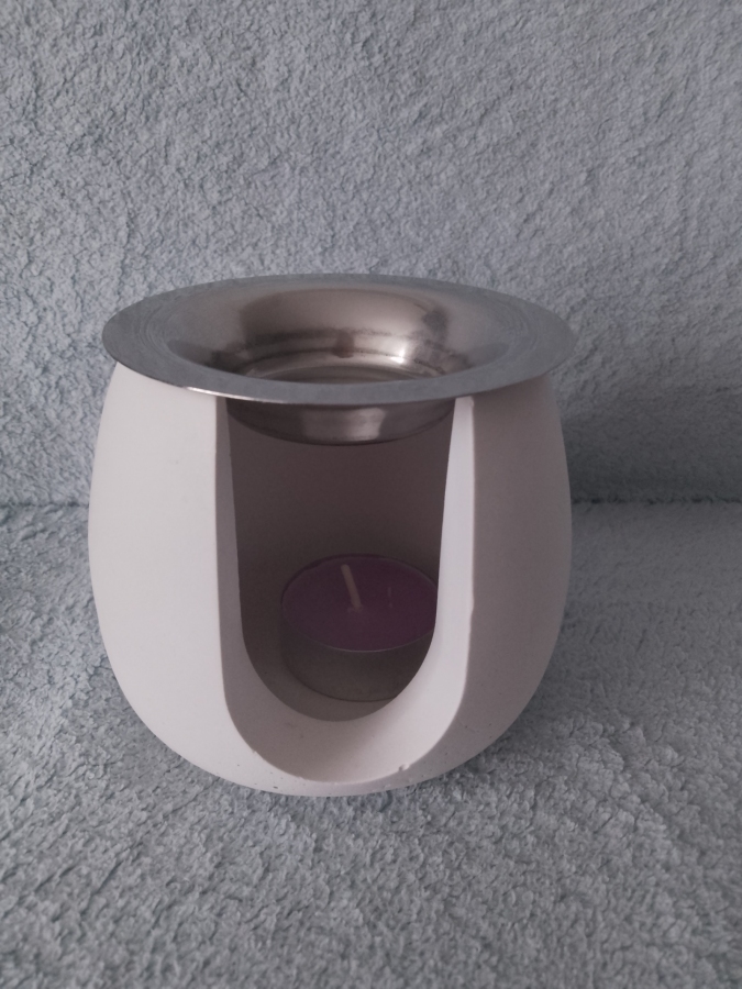 Przedmiot wykonany jest z gipsu ceramicznego zabezpieczony impregnatem do gipsu, może służyć jako świecznik ,dyfuzor do olejków lub wazonik po włożeniu pojemniczka miska metalowa w komplecie dostępny w 3 kolorach biały, fiolet, zielony.