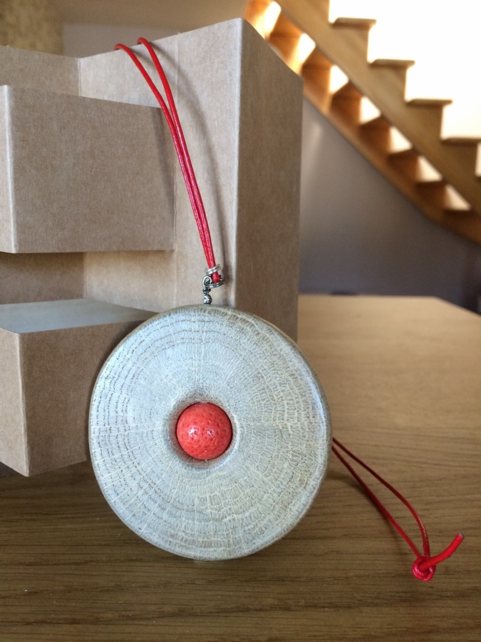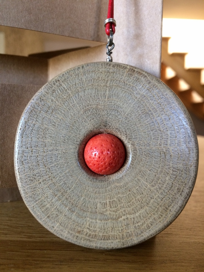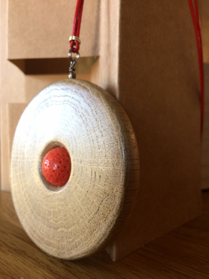 Naszyjnik wykonany ręcznie z gałęzi dębu znalezionej w lesie, z pięknie zarysowanymi słojami, z koralem. Jedyny egzemplarz według autorskiego projektu. Waga: 29 g (z rzemykiem jubilerskim) Długość rzemienia jubilerskiego do dostosowanie (wiązanie na węzeł)