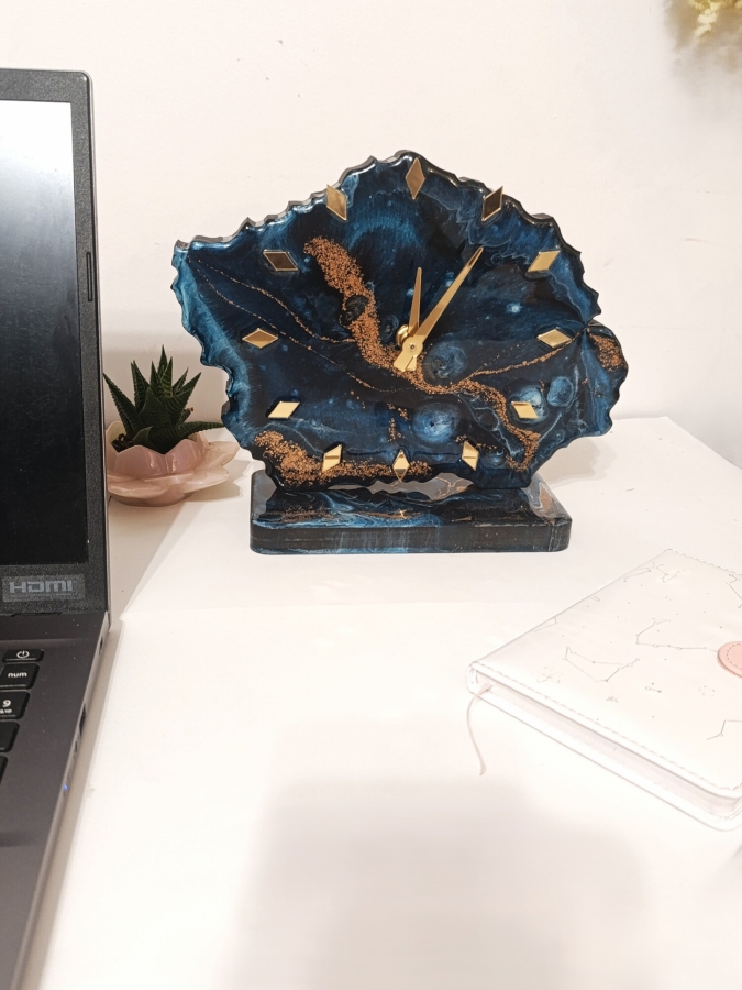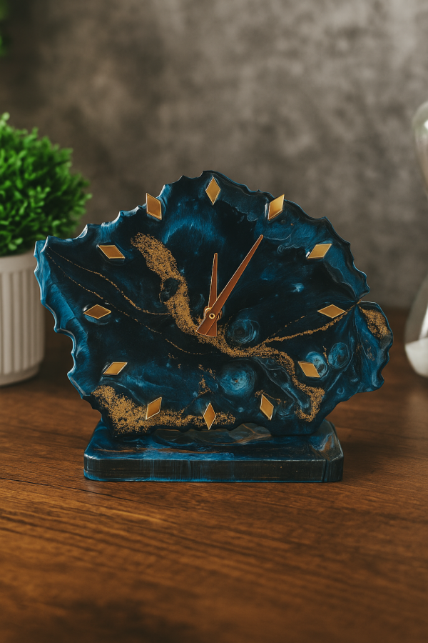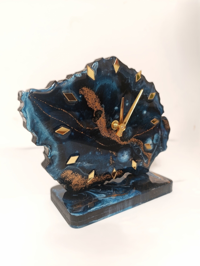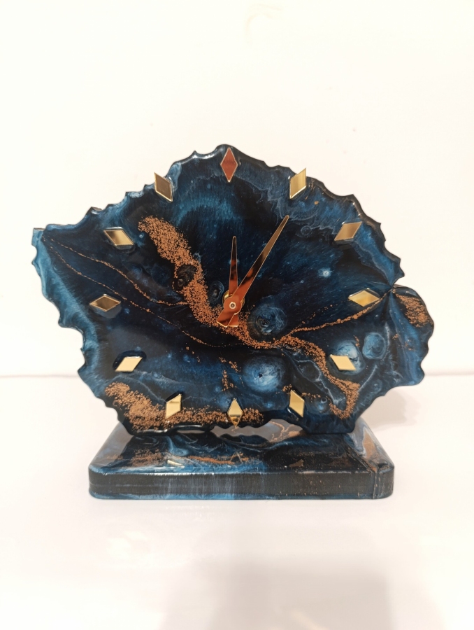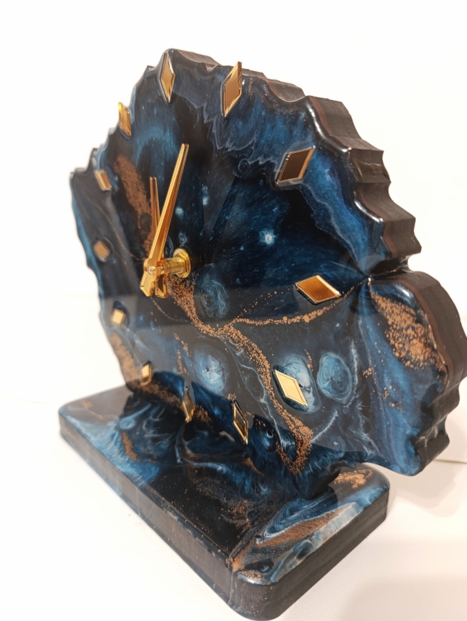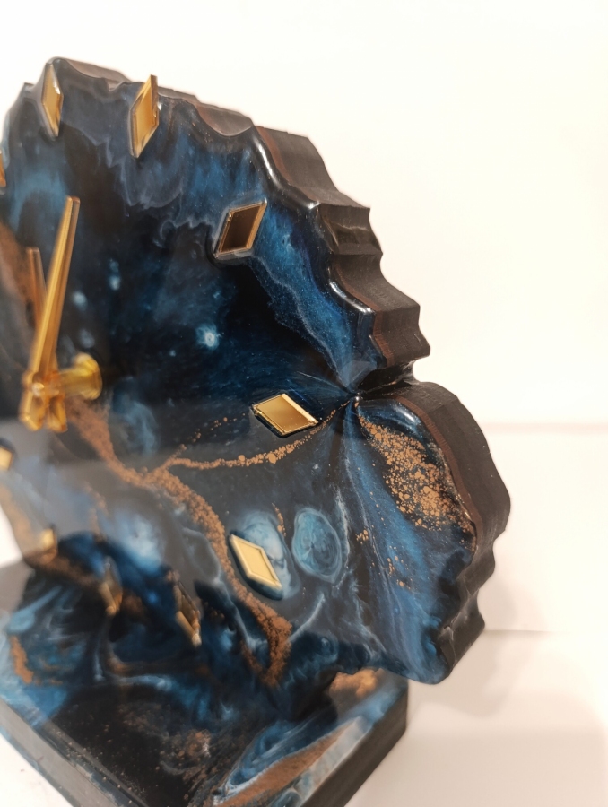 Ekskluzywny zegar stołowy z żywicy epoksydowej – unikatowa dekoracja i funkcjonalność w jednym! Szukasz wyjątkowego dodatku do wnętrza? Ten ręcznie wykonany zegar stołowy to połączenie sztuki i precyzji. Jego nieregularny, artystyczny kształt przypomina naturalne formacje, takie jak geody czy koralowce, a głęboki granatowy kolor z zatopionymi złotymi akcentami przyciąga wzrok i dodaje elegancji. Specyfikacja produktu: Materiał: żywica epoksydowa + solidna drewniana podstawa Mechanizm: cichy, precyzyjny mechanizm kwarcowy (nie tyka!) Wskazówki i indeksy godzinowe: złoty kolor, stylowe wykończenie Wymiary: 25*25 Zasilanie: 1 bateria AA (brak w zestawie) Idealny jako prezent lub designerski akcent do salonu, biura czy sypialni. Każdy egzemplarz jest niepowtarzalny – wykonany ręcznie z dbałością o każdy detal.