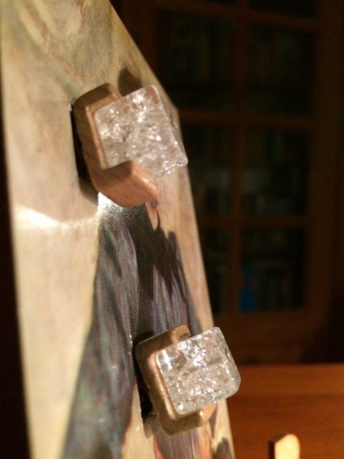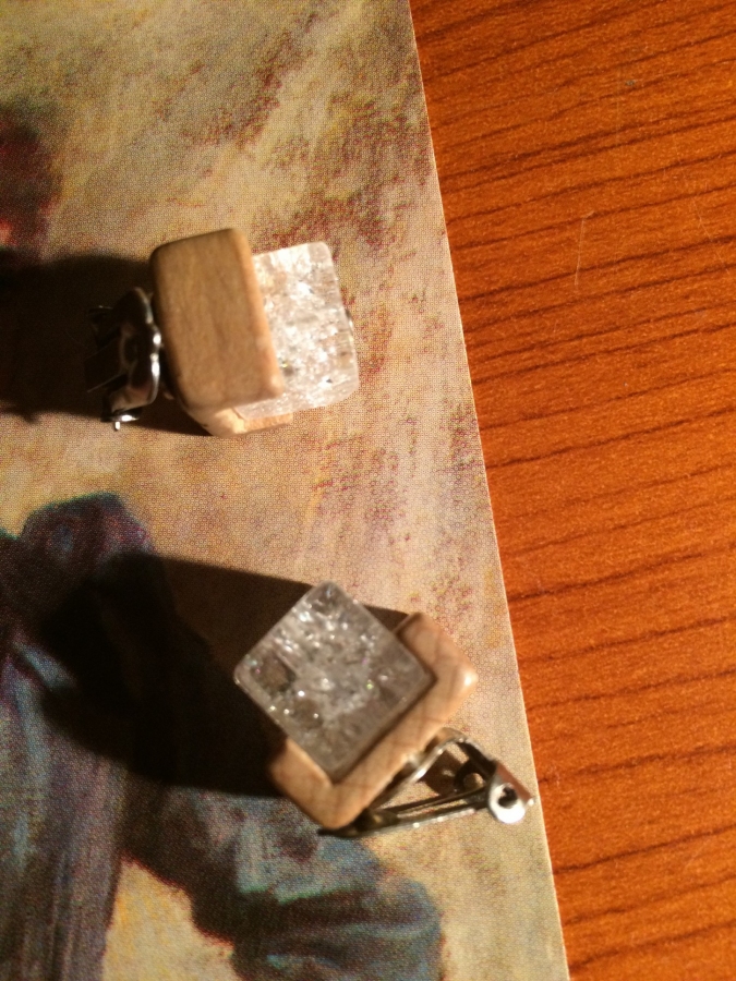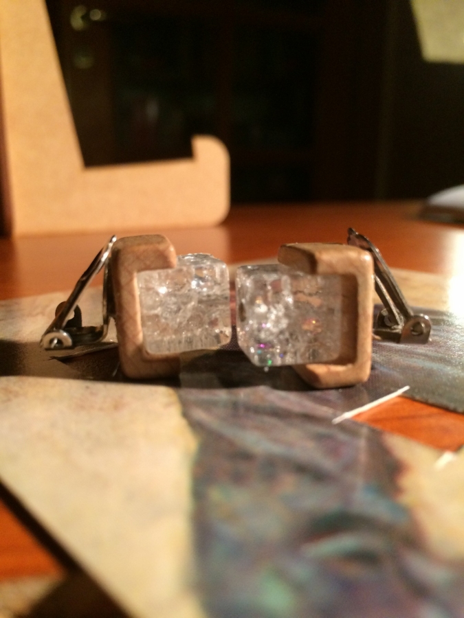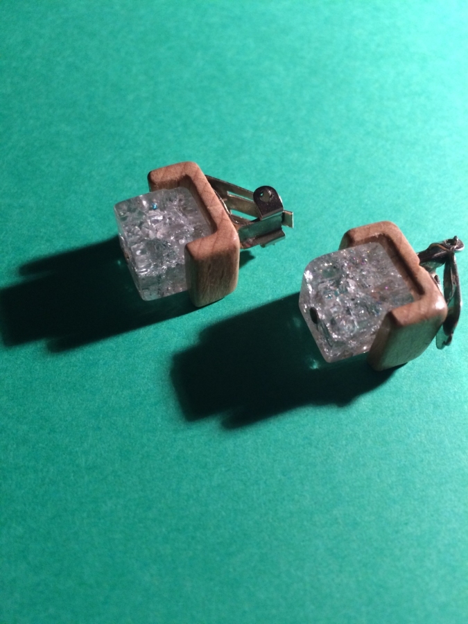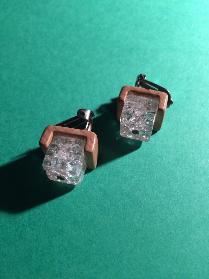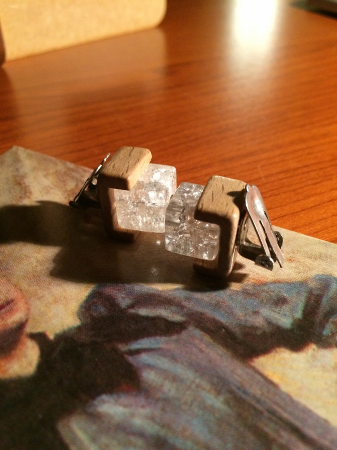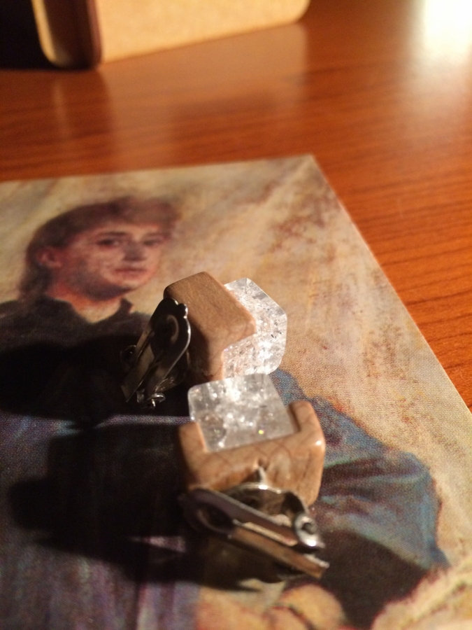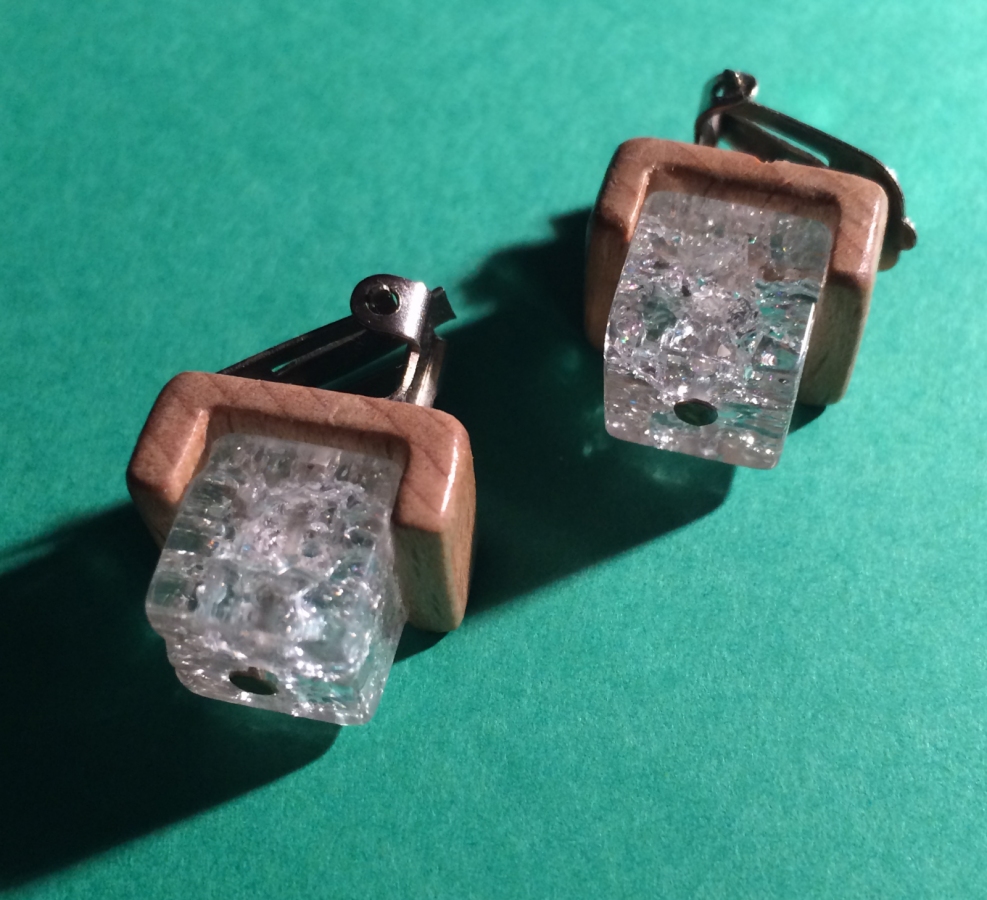 Klipsy wykonane ze szczebla starej jesionowej drabiny, z jednego elementu, nie klejone, z kryształem górskim. Jedyny egzemplarz według autorskiego projektu i przez autora własnoręcznie wykonany. Waga 9 g (2 x 4,5 g) Kryształ (sześcian) o boku 10 mm