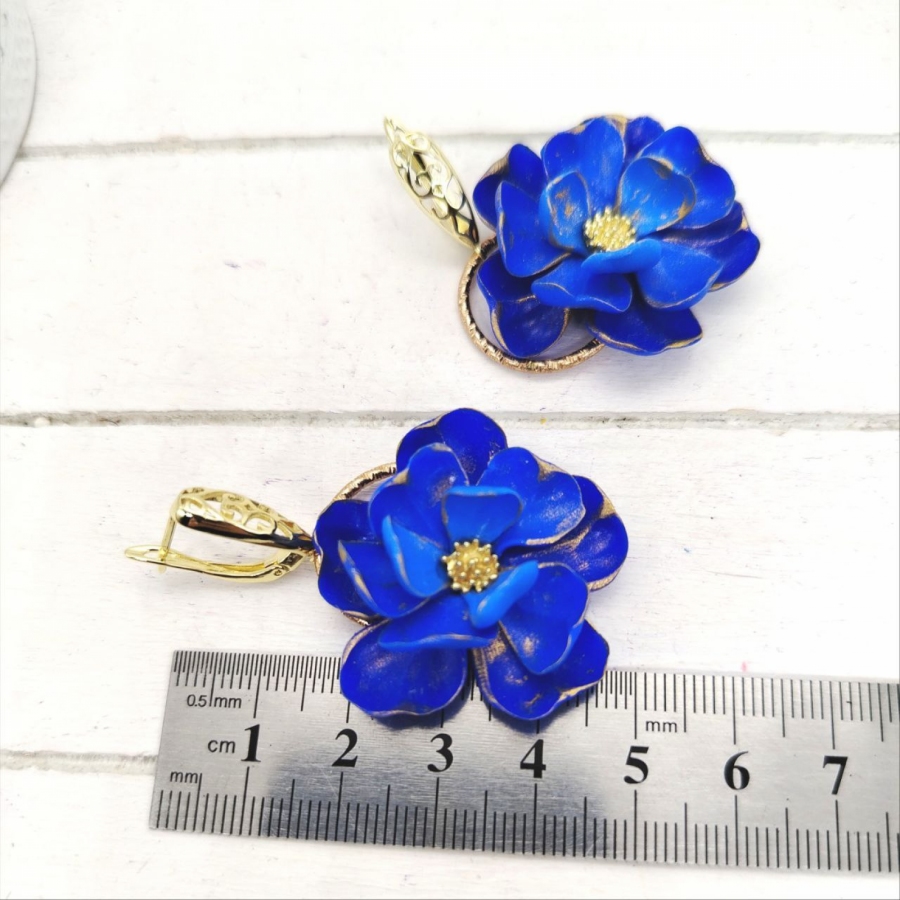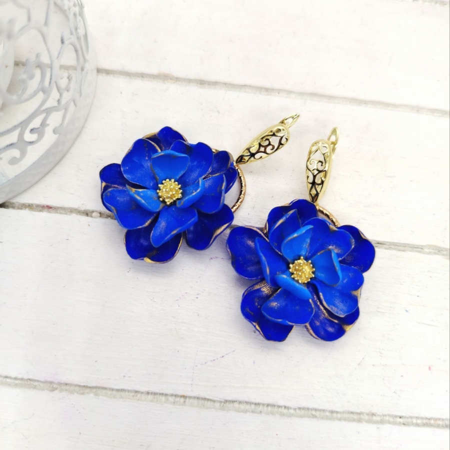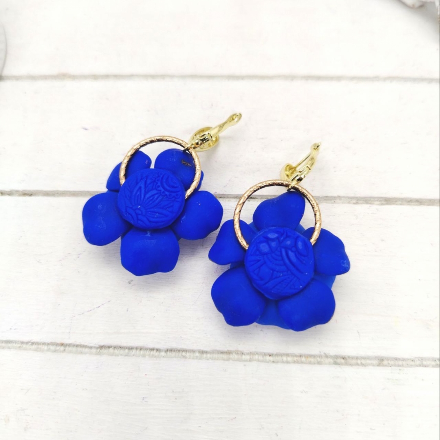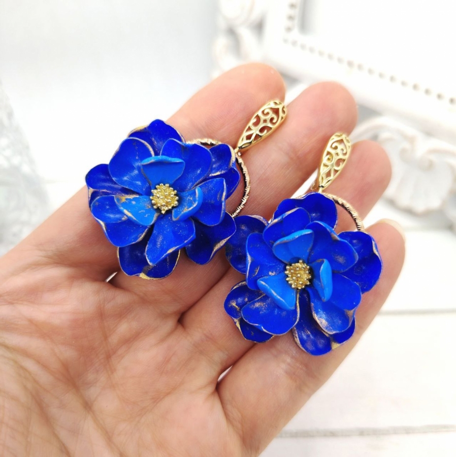 W błękicie królewskim noc się przegląda, złotem otula, gdy światło ją żąda. Jak niebo w sukni pełnej wspomnień, migocze ciszą — i śni o dopełnieniu. Kwiat w złocie lśni przy uchu delikatnie, a każda linia płonie subtelnie i szlachetnie. To nie kruszec, lecz barwa — słońcem malowana, jak wspomnienie lata w dłoni schowana. Opis uzupełniający (prozą): Kolczyki wykonane ręcznie z polimerowej gliny w kolorze królewskiego błękitu. Brzegi i środek utrzymane są w złotej tonacji — to barwa inspirowana blaskiem metalu, nie prawdziwa pozłota. Furmitura i sztyfty w formie złocistego kwiatka pięknie dopełniają całość. Całość zapakowana w eleganckie pudełko – gotowa na prezent dla kobiety, która kocha subtelny luksus i artystyczne detale.