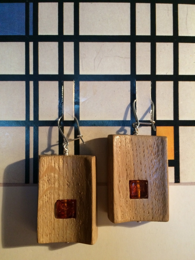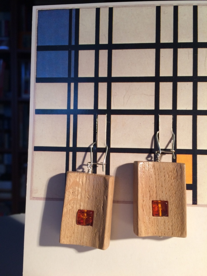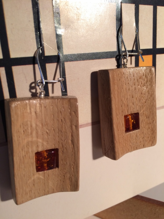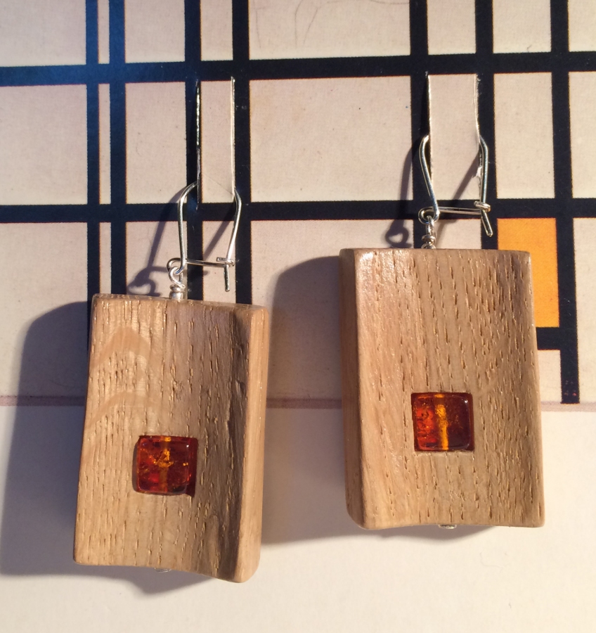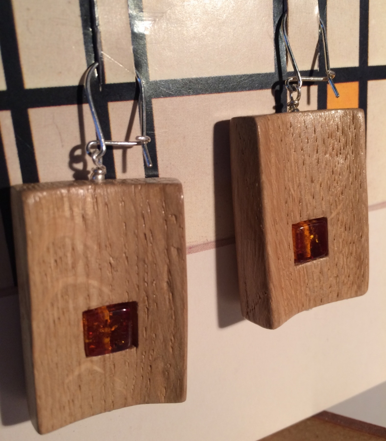 Kolczyki wykonane z dębowej starej deski znalezionej w opuszczonym siedlisku na Podlasiu, z bursztynowym „okienkiem” i srebrnymi biglami. Jedyny egzemplarz wykonany ręcznie bez użycia narzędzi mechanicznych. Waga: 10 g (2 x 5 g)