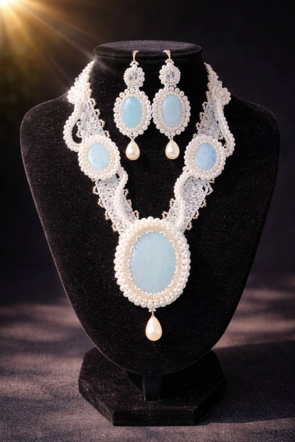 Zanurz się w świecie ponadczasowej elegancji… Ten wyjątkowy komplet biżuterii zachwyca subtelnym blaskiem i kunsztem wykonania. Delikatne perły oplatają misterną formę naszyjnika, tworząc harmonijną kompozycję z centralnym, błękitnym kamieniem o hipnotyzującej głębi. Jego chłodny odcień przywodzi na myśl spokojne wody laguny — czyste, szlachetne i pełne klasy. Długie, smukłe kolczyki idealnie dopełniają całość, podkreślając linię szyi i dodając twarzy świetlistego uroku. Każdy detal został zaprojektowany z myślą o kobiecie, która pragnie wyróżniać się subtelnym luksusem. To nie tylko biżuteria — to manifest stylu, elegancji i wyjątkowości. Idealna na wieczorne wyjścia, uroczyste okazje… i chwile, w których chcesz poczuć się naprawdę niezwykle.