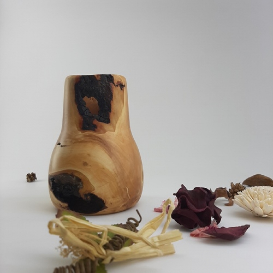 Mały wazon dekoracyjny z korzenia jabłoni to unikatowy element wystroju, który łączy naturalne piękno drewna z rzemieślniczą precyzją. Powstał z jednego kawałka korzenia, dzięki czemu zachował swój organiczny charakter, widoczny w naturalnych otworach, pęknięciach i nieregularnym układzie słojów. Każdy detal podkreśla indywidualność tego przedmiotu — nie ma dwóch identycznych egzemplarzy. ???? Charakter i wykonanie Wazon został w pełni wykonany ręcznie, co nadaje mu wyjątkowy, artystyczny charakter. Gładka powierzchnia i naturalne przebarwienia drewna tworzą harmonijną kompozycję, idealną do wnętrz inspirowanych naturą, stylem rustykalnym, boho czy minimalistycznym. Do impregnacji użyto oleju z dodatkiem wosku, posiadającego certyfikat EN71-3. Oznacza to, że produkt jest bezpieczny w kontakcie z żywnością oraz może być stosowany na przedmiotach przeznaczonych dla dzieci. ???? Wymiary Szerokość: 10 / 6 cm Wysokość: 14 cm Głębokość: 12 cm Średnica otworu: 5 cm ???? Zastosowanie Wazon świetnie sprawdzi się jako dekoracja półki, komody czy stołu. Może pełnić funkcję samodzielnej ozdoby lub stanowić oprawę dla suchych kompozycji roślinnych. Jego naturalny wygląd wprowadza do wnętrza ciepło i subtelną elegancję