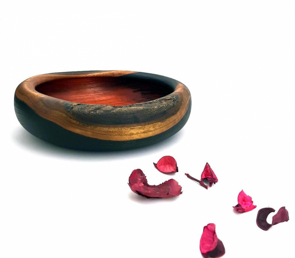 Przedstawiamy dzieło, które jest manifestem surowego designu i artystycznej obróbki drewna. W pracowni Robie w drewnie wzięliśmy na warsztat szlachetną akację, by nadać jej zupełnie nowe, głębokie oblicze. To nie jest zwykła misa – to gra cieni, ognia i koloru. Co sprawia, że ten projekt jest wyjątkowy? Ogień z zewnątrz: Zewnętrzna strona misy została poddana procesowi kontrolowanego opalania. Ta technika nie tylko nadaje drewnu głęboką, węglową czerń, ale także uwypukla naturalną strukturę słojów, sprawiając, że są one wyczuwalne pod palcami. Bejca od wewnątrz: Wnętrze misy zostało starannie zabarwione bejcą, co pozwoliło na uzyskanie nasyconego koloru przy jednoczesnym zachowaniu widocznego rysunku drewna akacjowego. Akacja, znana ze swojej twardości i trwałości, zyskuje dzięki temu nowoczesny, luksusowy wygląd. Festiwal kontrastów: Połączenie matowej, opalanej skorupy z głębią barwionego środka tworzy efekt trójwymiarowości, który przyciąga wzrok i intryguje. Trwałość akacji: Wykorzystanie drewna akacjowego gwarantuje, że przedmiot jest odporny na wilgoć i upływ czasu, zachowując swój artystyczny charakter przez lata. Zastosowanie: Misa idealnie odnajdzie się we wnętrzach typu Loft, Industrial oraz wszędzie tam, gdzie poszukiwane są mocne, charakterne akcenty. Doskonała jako dekoracja salonu, patera na klucze lub unikatowy prezent dla miłośnika designu.
