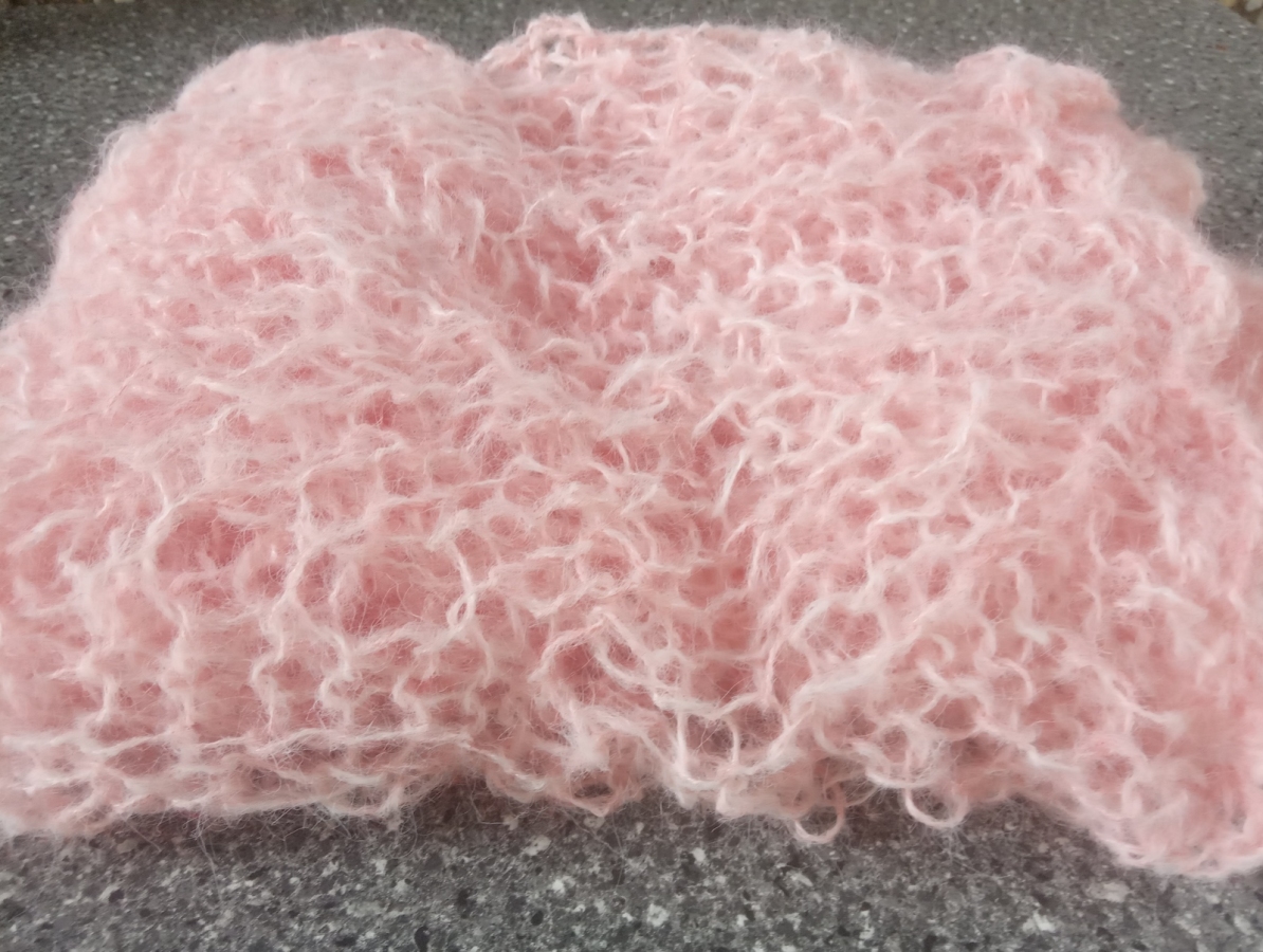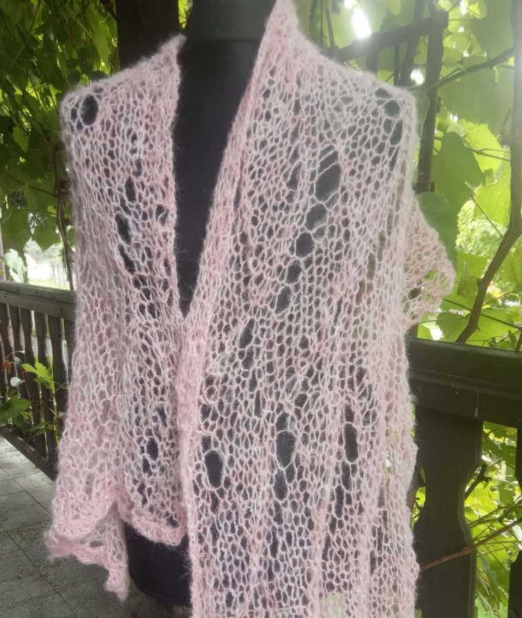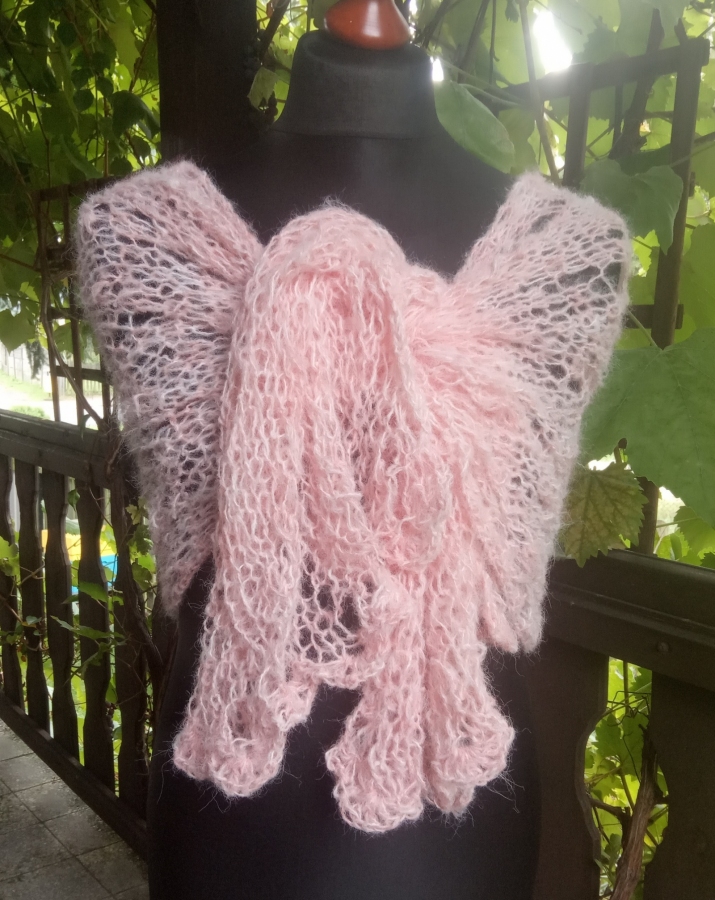 Różowy elegancki szal w całości wykonany ręcznie na drutach pięknym wzorem. Jest bardzo delikatny, leciutki i puszysty. Będzie doskonałym dodatkiem ślubnym, wieczorowym lub codziennym. Ozdobi każdą stylizację. Jest plastyczny i rozciągliwy, więc można nosić go na różne sposoby. Wymiary: 165 cm x 45 cm. Skład: moher 15 %, alpaka 30 %, akryl 55 %. Gotowy do wysyłki