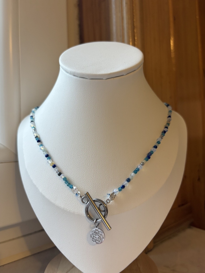 Naszyjnik handmade z kamieni naturalnych, długość 37 cm. Wykonany ręcznie z apatytu, amazonitu, lapis lazuli i opalu. Zapięcie typu toggle, zawieszka i zapięcie ze stali chirurgicznej. Stan: nowy