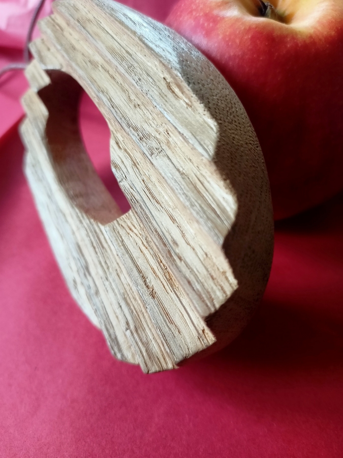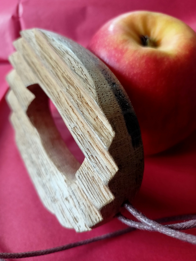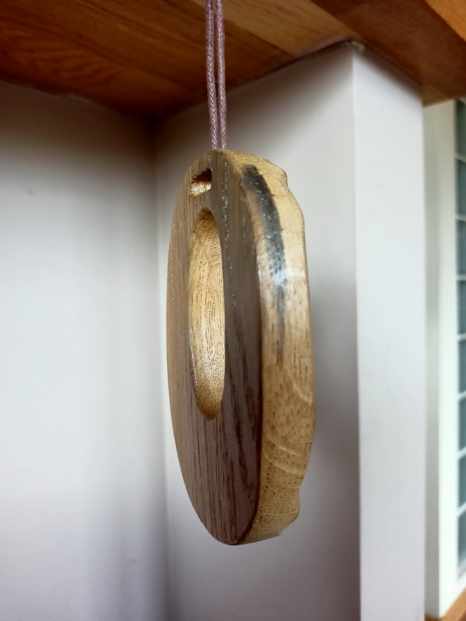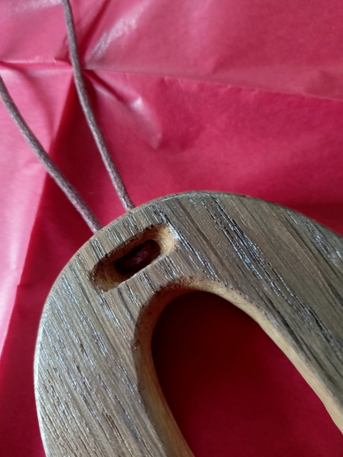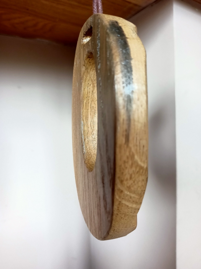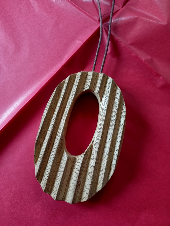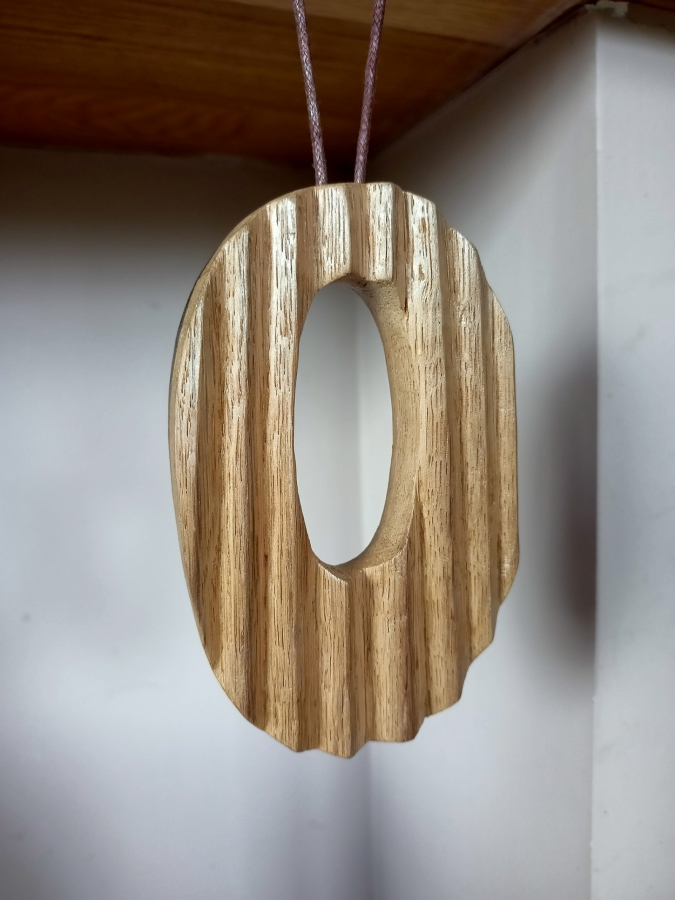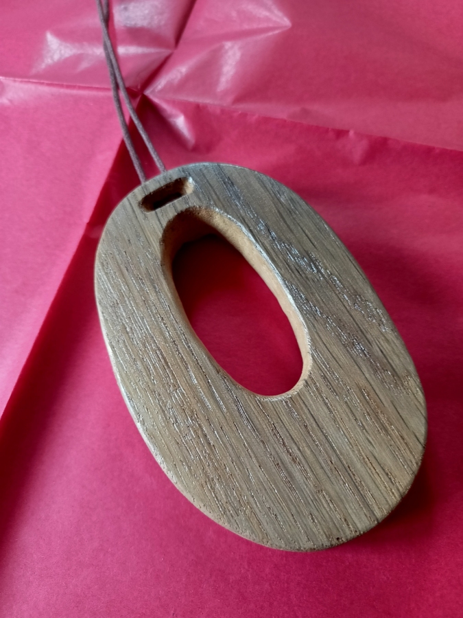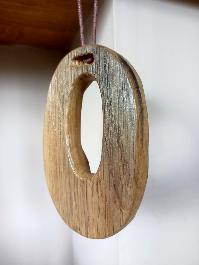 Naszyjnik wykonany z części dna dębowej starej deski znalezionej w opuszczonym siedlisku na Podlasiu. Całość wykonana ręcznie, narzędziami snycerskimi bez użycia maszyn. Załamujące się na wgłębieniach światło podkreśla naturalne piękno drewna. Sznurek jubilerski do wiązania.