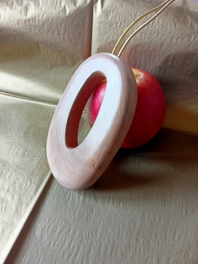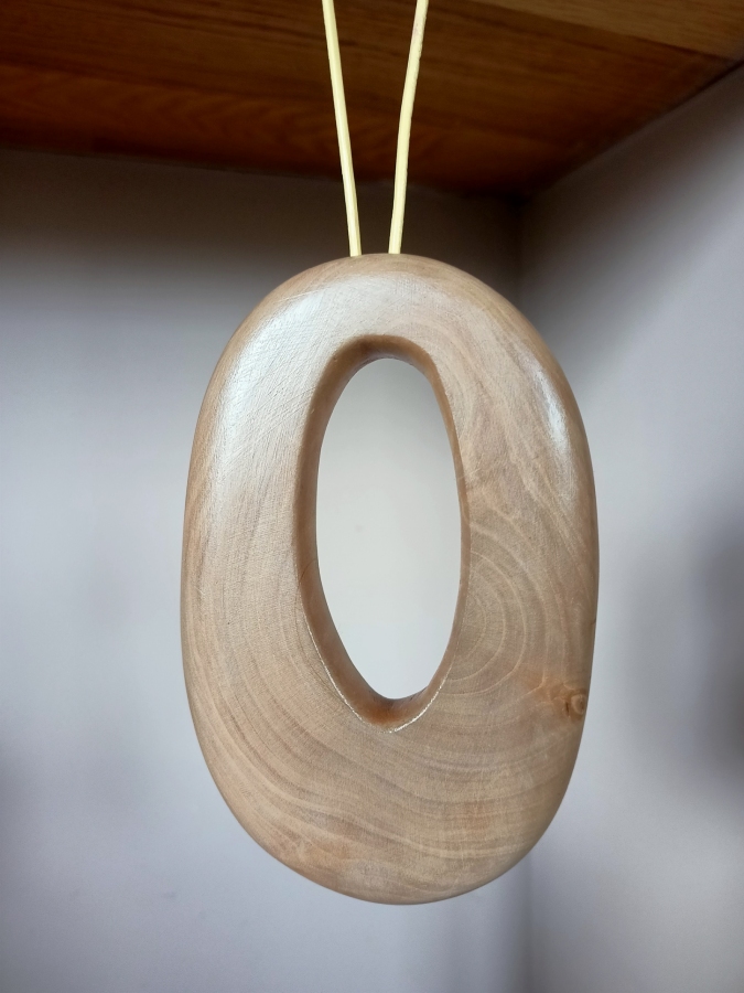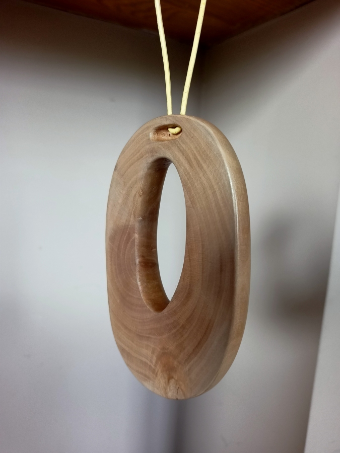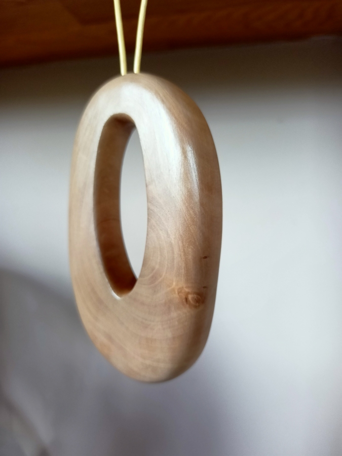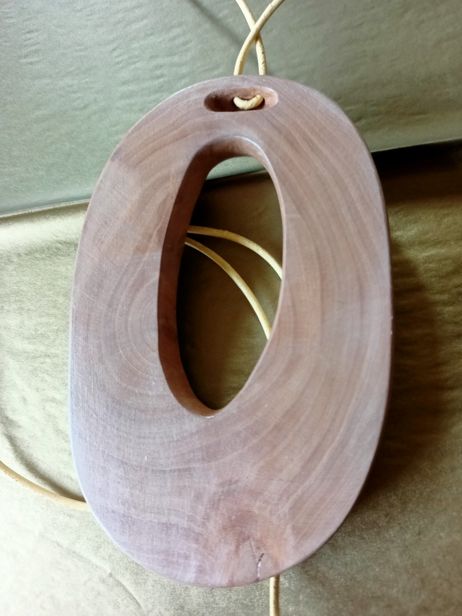 Unikatowy, minimalistyczny naszyjnik eko wykonany z gałęzi gruszy rosnącej na miedzy podlaskich pól, zwalonej przez wichurę. Wykonany ręcznie. Przepięknie zarysowane słoje wymusiły prostą formę. Natura jest największym artystą. Rzemień barwiony do wiązania.