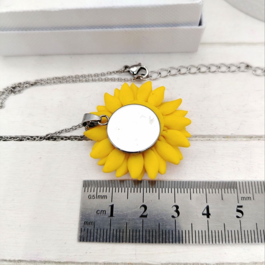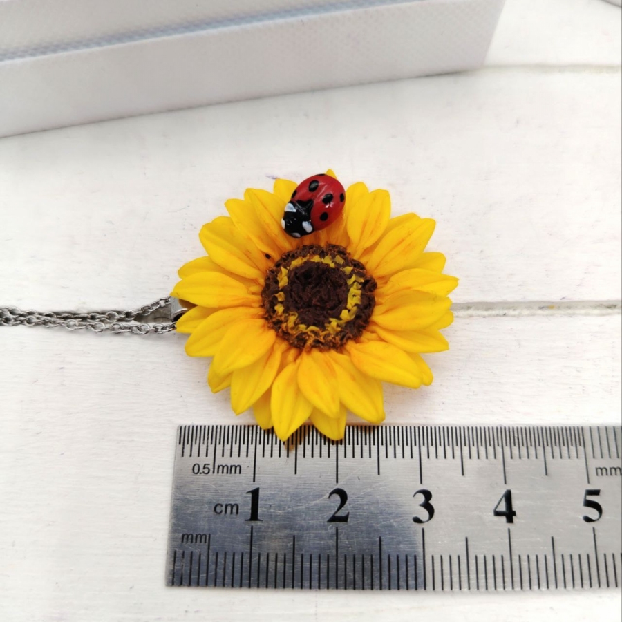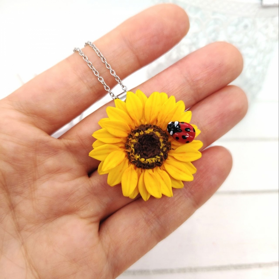 Uroczy naszyjnik z kwiatem słonecznika i małą biedronką, wykonany ręcznie z polimerowej gliny. Średnica zawieszki ok. 3,5 cm. Każdy detal modelowany i cieniowany pastelami z najwyższą precyzją, dzięki czemu każdy egzemplarz jest wyjątkowy. Zawieszony na łańcuszku ze stali nierdzewnej, która nie ciemnieje i nie uczula. Biżuteria zapakowana w eleganckie pudełko – gotowa na prezent.