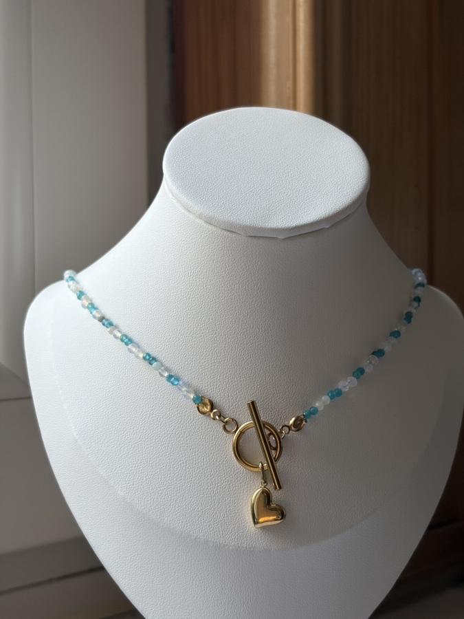 Ręcznie robiony zestaw: naszyjnik + pierścionek Długość naszyjnika ok. 46 cm – fajnie układa się na szyi i pasuje do codziennych stylizacji, ale też na bardziej wyjątkowe okazje. Zapięcie i wisiorek ze stali chirurgicznej, więc jest trwały i nie powinien uczulać. Użyte kamienie naturalne: apatyt, amazonit i opal – każdy element ma trochę inny odcień, dzięki czemu całość wygląda delikatnie i z charakterem.