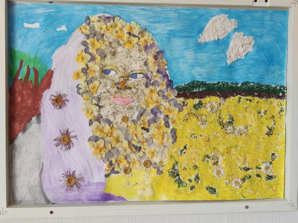 Inspiracją do wykonania przedmiotowego obrazu był spacer na łąkę. Rosły na niej wiosenne kwiaty, które swym pięknem przyciągnęły mnie i sprawiły, że poczułam się, tak jak bym była ich częścią. To co utkwiło w mojej pamięci i zostało odpowiednio wzmocnione przez wyobraźnię, postanowiłam utrwalić na obrazie. Do stworzenia obrazu wykorzystałam suszone kwiaty zbierane zarówno w moim ogrodzie jak i na łące. Dodatkowo suszki uzupełniłam farbami i kredkami.