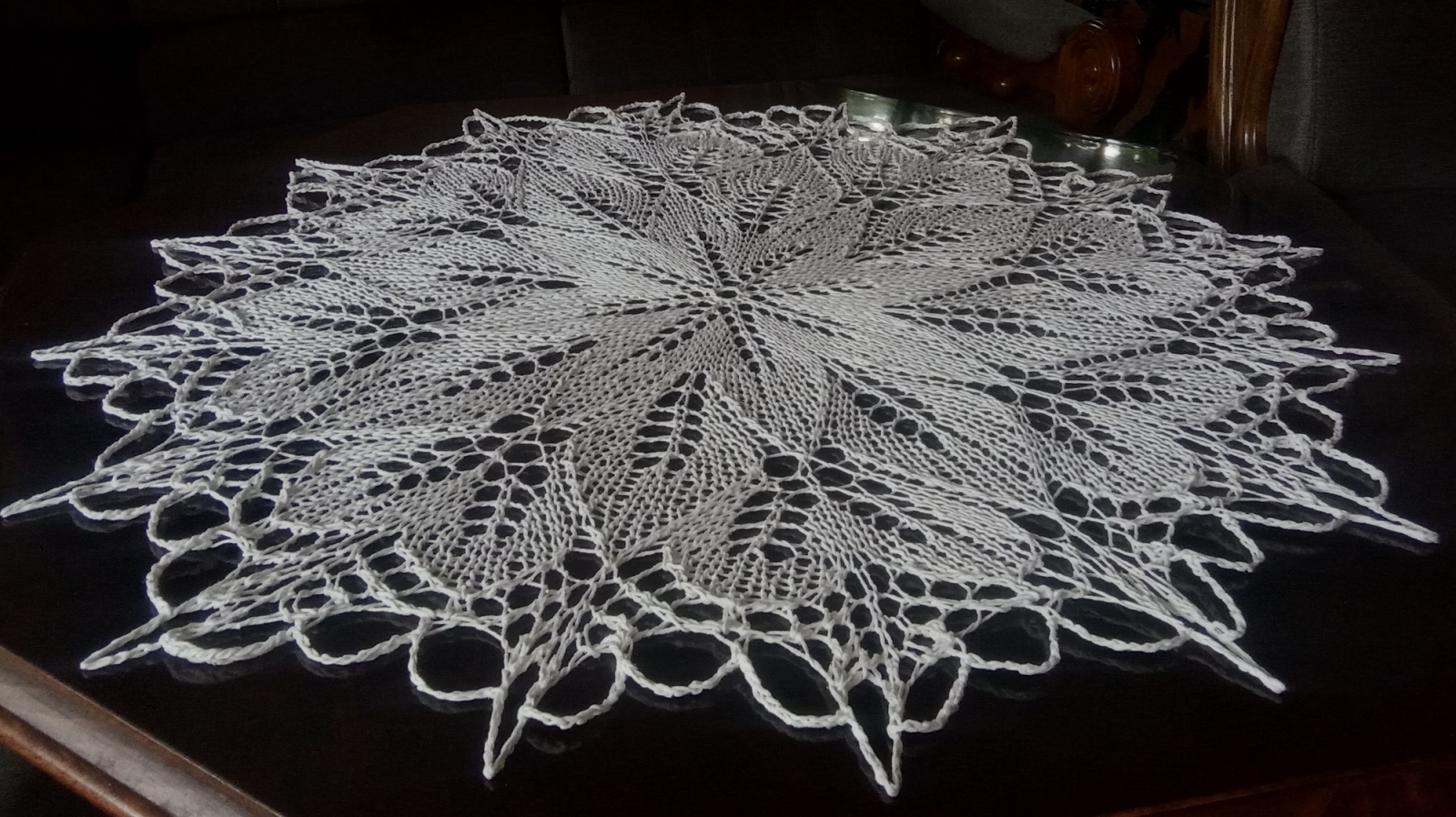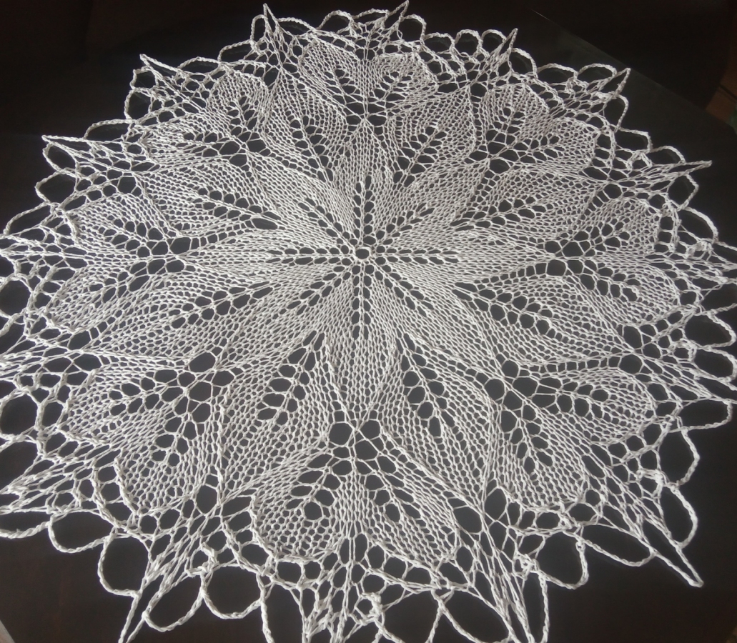 Obrus wykonany na drutach. Piękna a zarazem oryginalna ozdoba mieszkania, ponieważ koronki robione na drutach są wyjątkowo delikatne i mają niecodzienny urok. Dodatkowo wyróżnia je technika wykonania, która obecnie jest rzadkością z uwagi na trudność i pracochłonność. Zastosowany wzór sprawia wręcz hipnotyzujące wrażenie efektu 3D. Średnica obrusa 82 cm, bawełna 100%, kolor biały. Możliwość wykonania podobnego w innym wymiarze lub kolorze, wówczas cena uzależniona od rozmiaru. Obrus przedstawiony na zdjęciach gotowy do wysyłki.