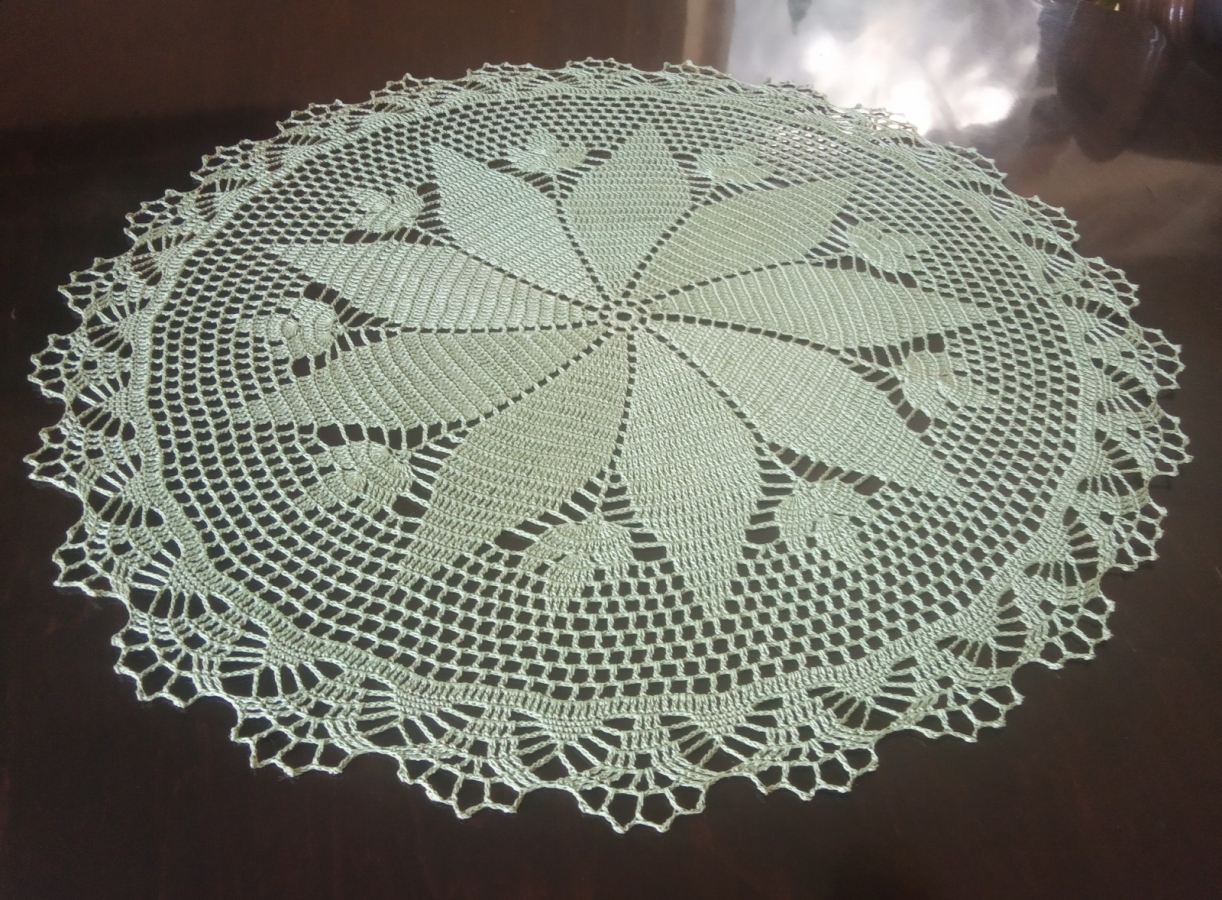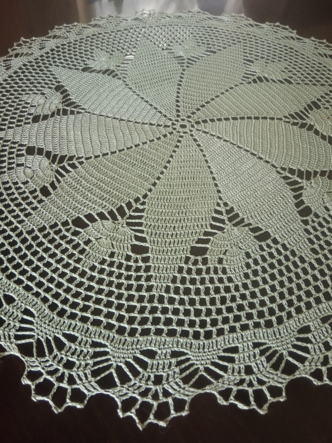 Serwetka wykonana w całości ręcznie z cienkiego kordonka, pięknym dekoracyjnym wzorem. Usztywniona. Średnica 57 cm, kolor zielony w odcieniu oliwkowym, bawełna 100% Gotowa do natychmiastowej wysyłki